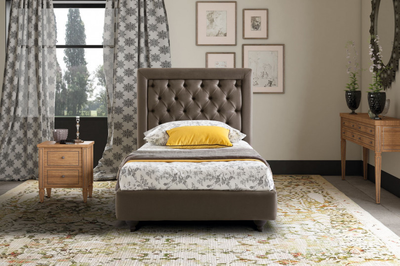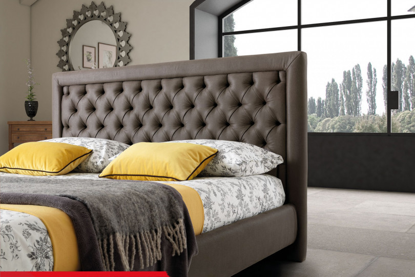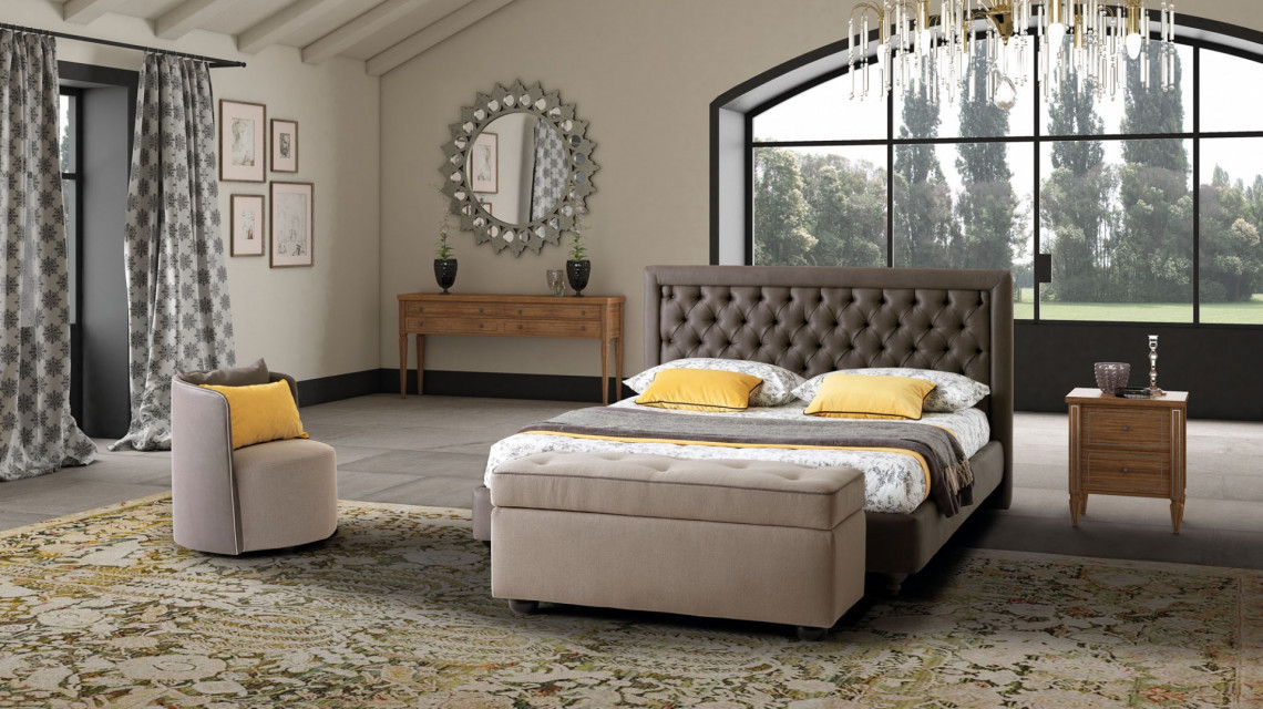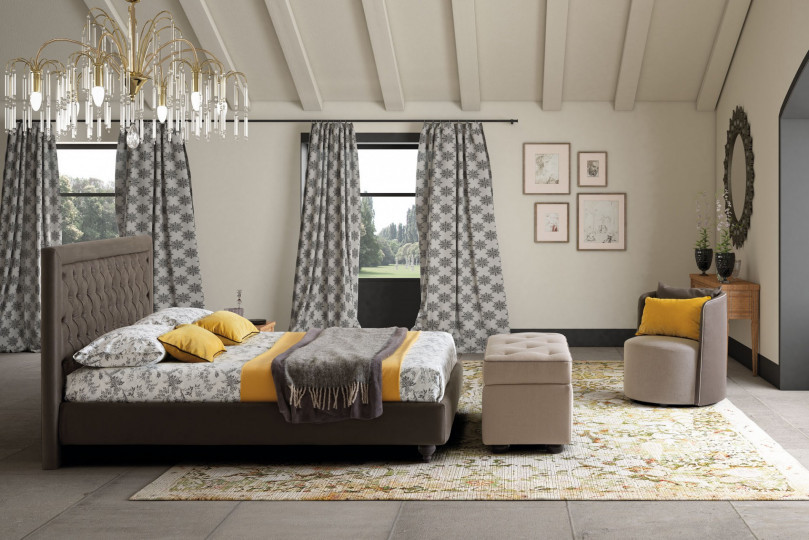A flat and regular frame hosts and tames the animated geometrical rehearsal staged by the prominent central capitonné, which is itself controlled by elegant fabric buttons or polished ornamental crystals - whose glares prevent the colour of the surface from looking dull. Monet`s balance is best expressed by the tranquil dialogue that is established between lines and volumes when they stand at the presence of an upholstery with a lordly character.