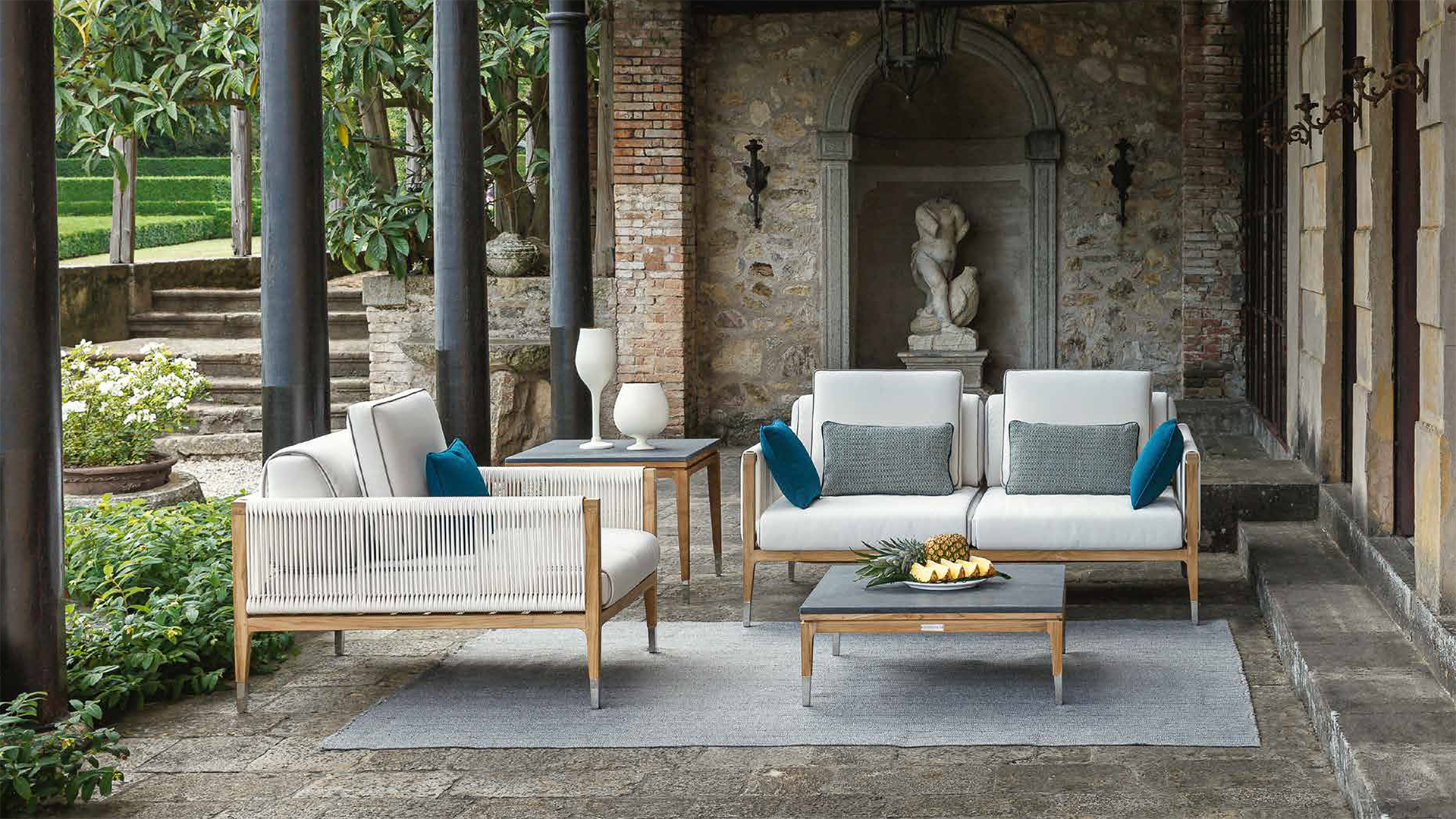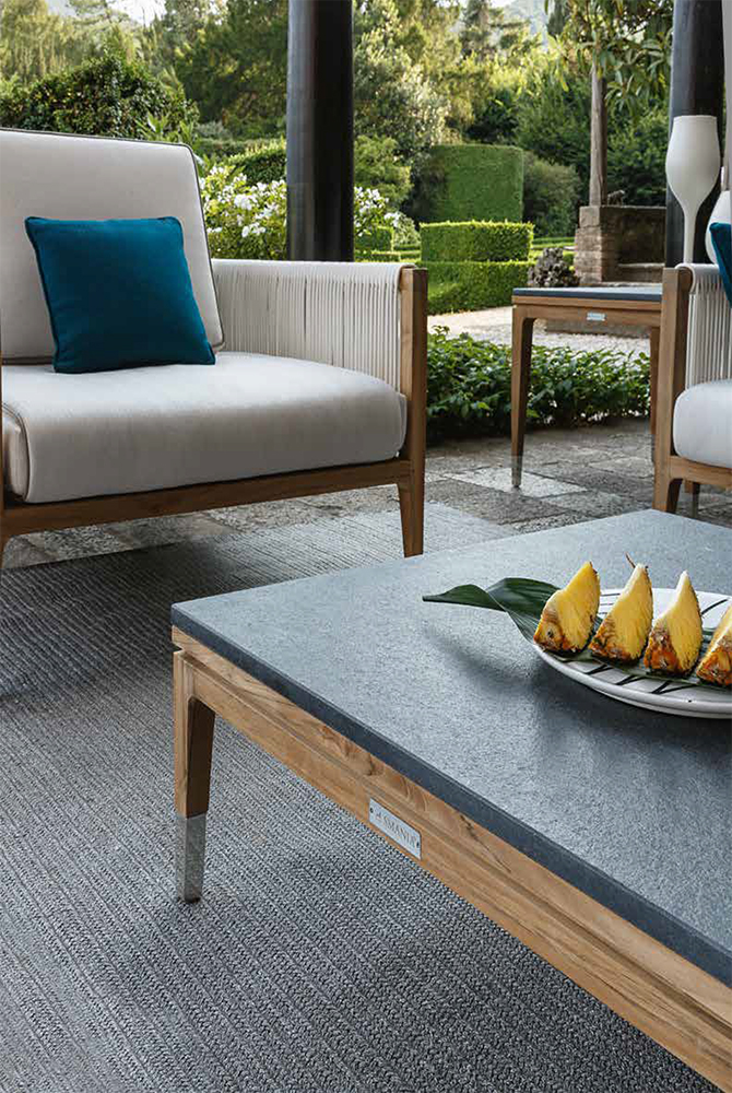 This low table is conceived to match with outdoor furnishing for luxury decors: combined with Amalfi couches and armchairs, creates the elegant Smania outfit that plays with the warm nuance of wood and the snowy beauty of white fabrics.