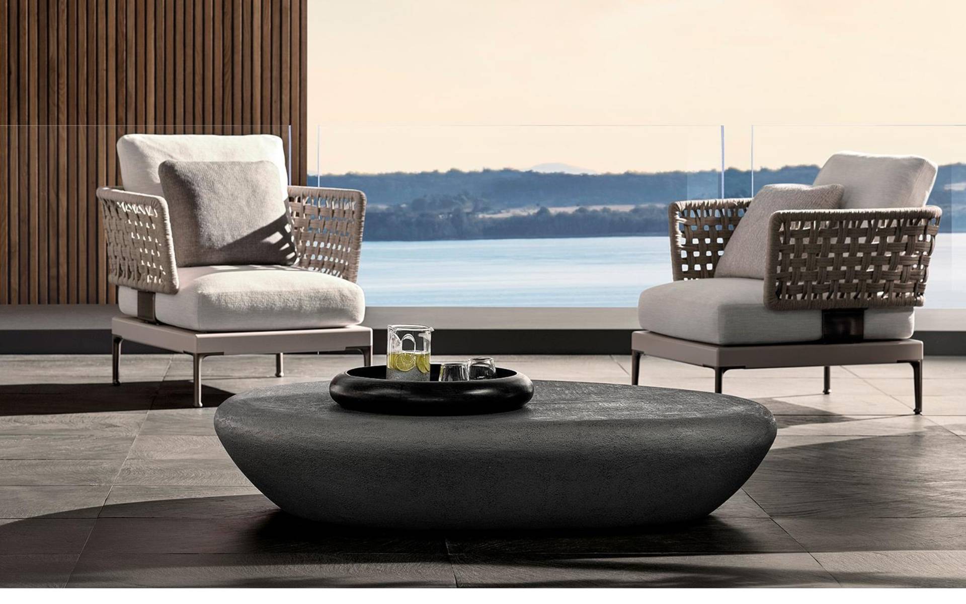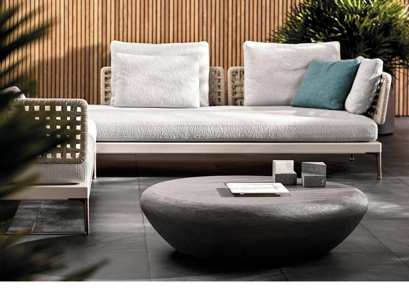 With its irregular shape and rounded corners, the Stony coffee table is inspired by pebbles, smoothed by the water of rivers, and it figures as a natural element in the landscape designed by the Outdoor Collection.