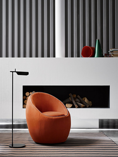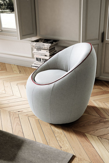Fabric furnished armchair with a futuristic profile, Britney favors a circular compositional form, thus freeing itself from the rigidity of traditional squared seating.