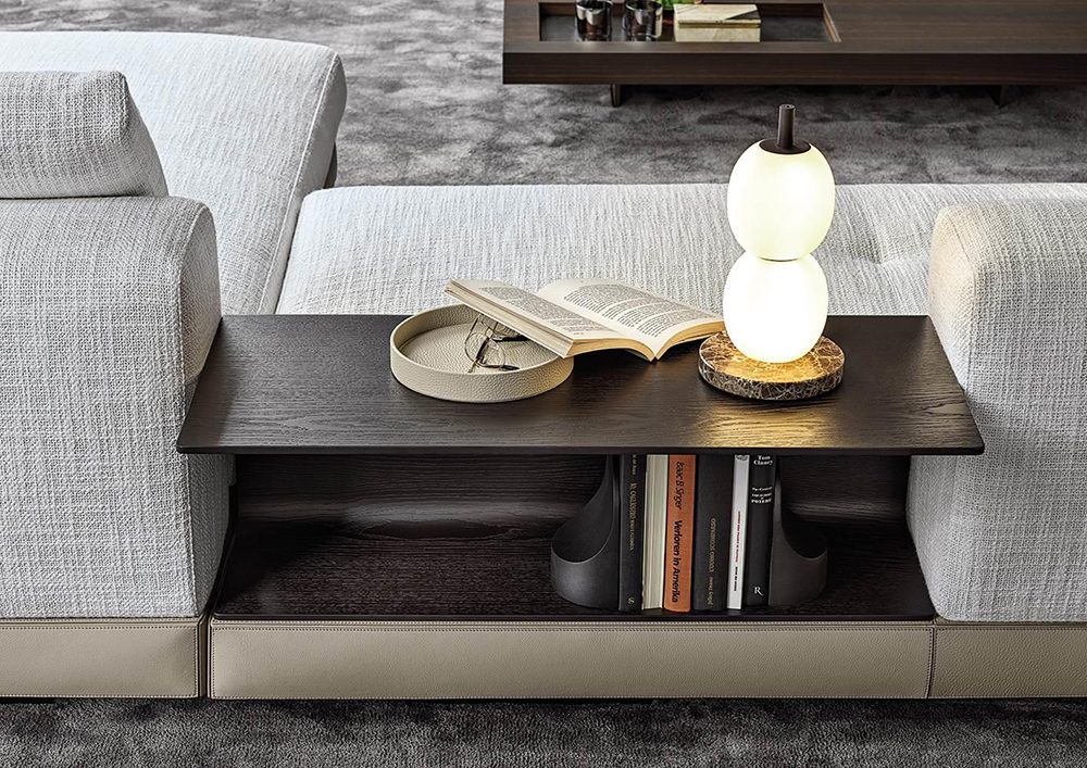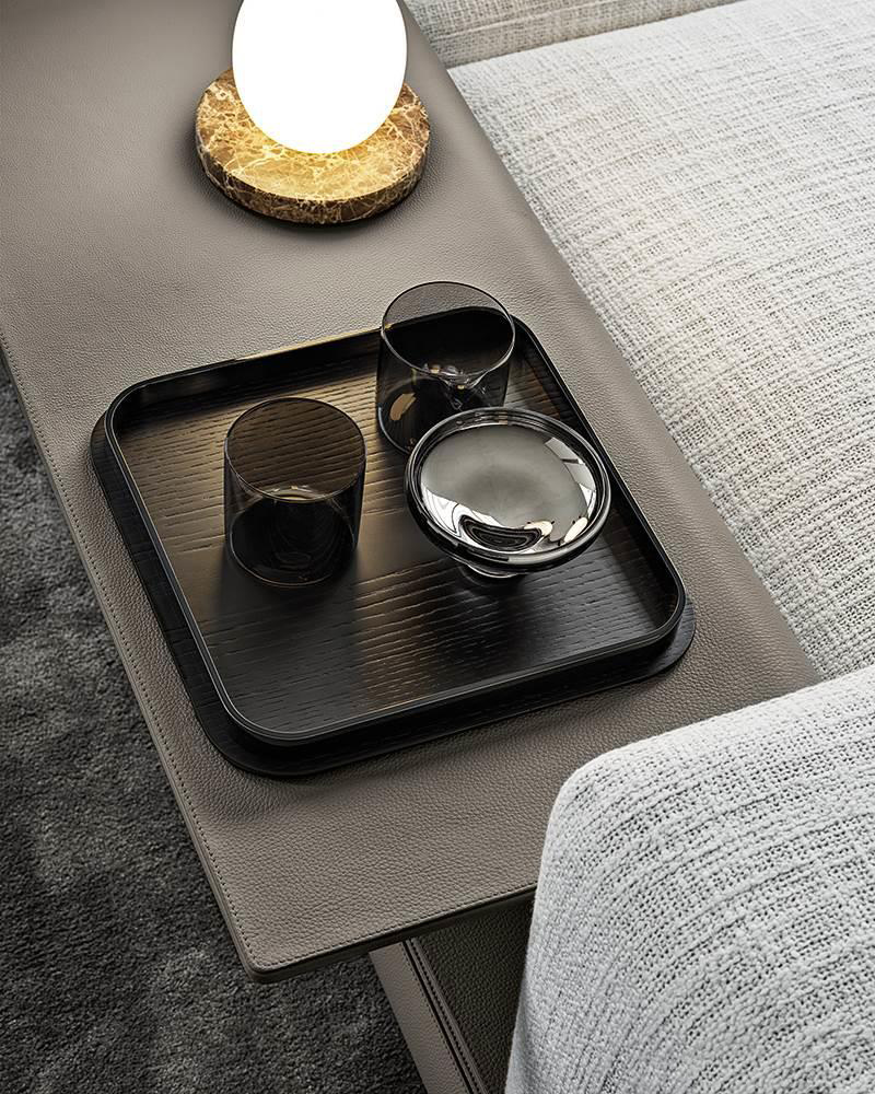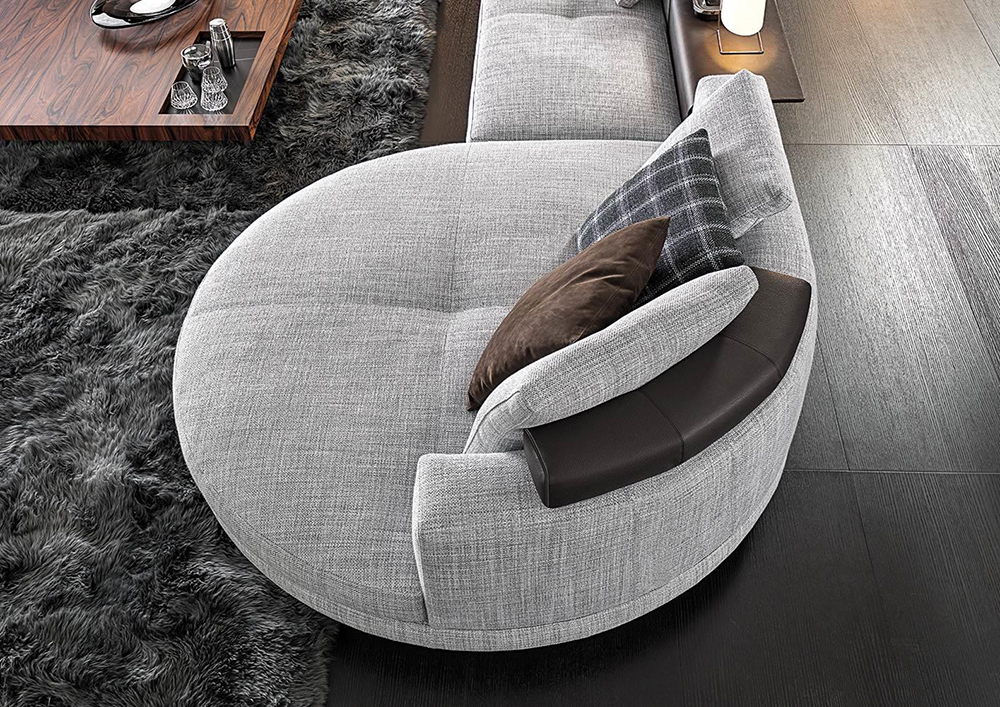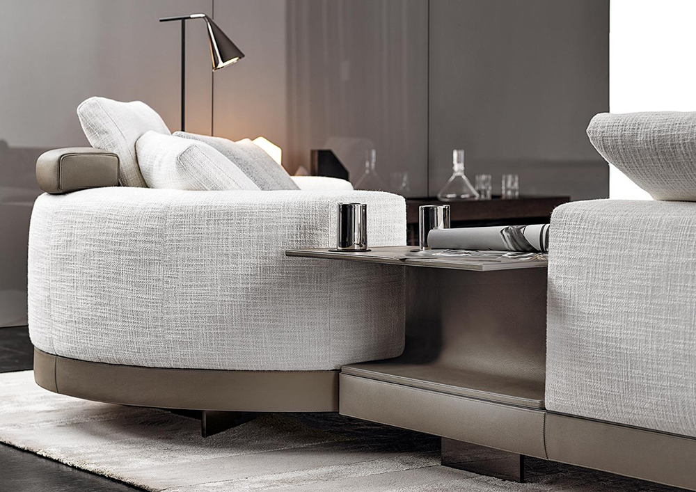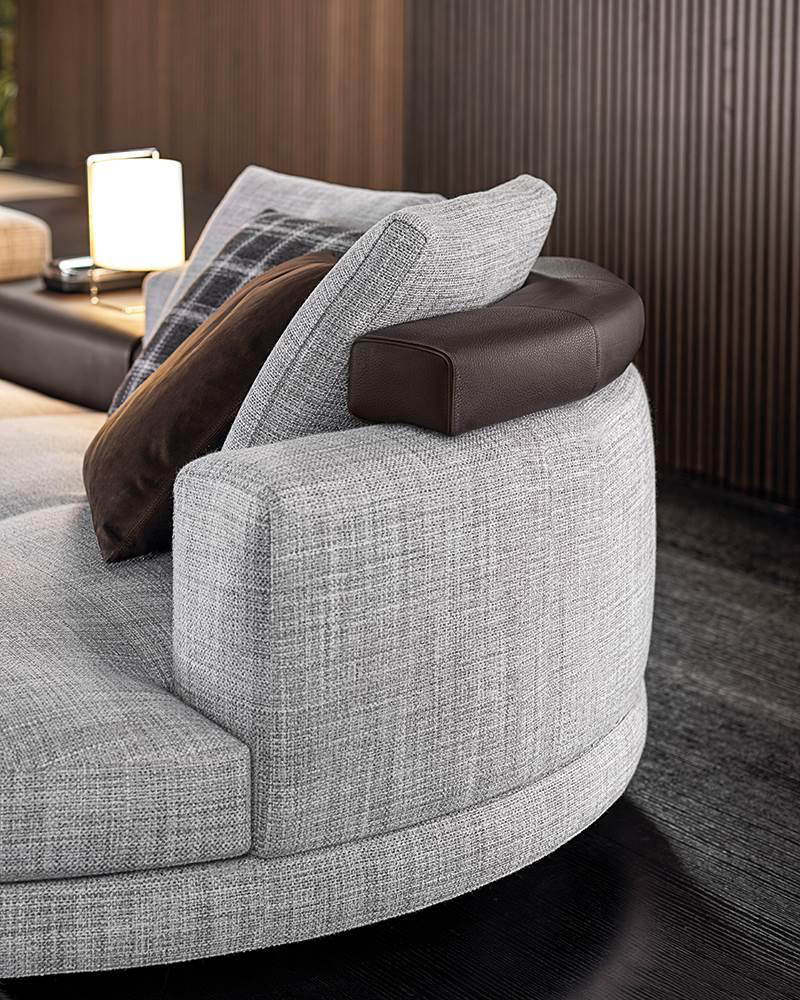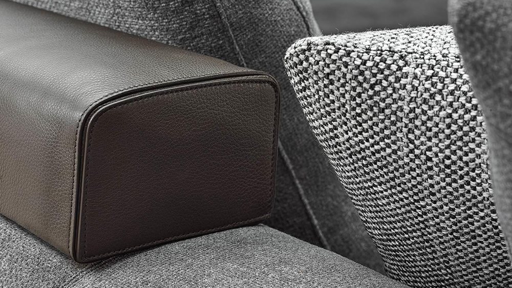 As well as the fabric covering, the padded structural base can also feature a covering with strips of leather, crafted with the same technique used in fine leather luggage-crafting. References to the concept of high-end leather goods are also found in the headrests and the elegant “C”-shaped Flap surfaces, which seamlessly blend into the seating elements, animating the compositions with a vibrant rhythm.