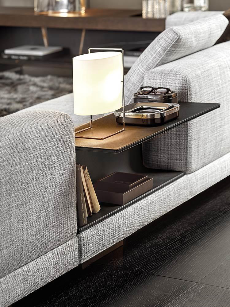 The structural base is raised from the ground on thin blades in extruded aluminium in a Brandy polished varnished finish, positioned at the front, giving the sofa an appealing and airy look, and recalling the metal parts of trunks and suitcases.