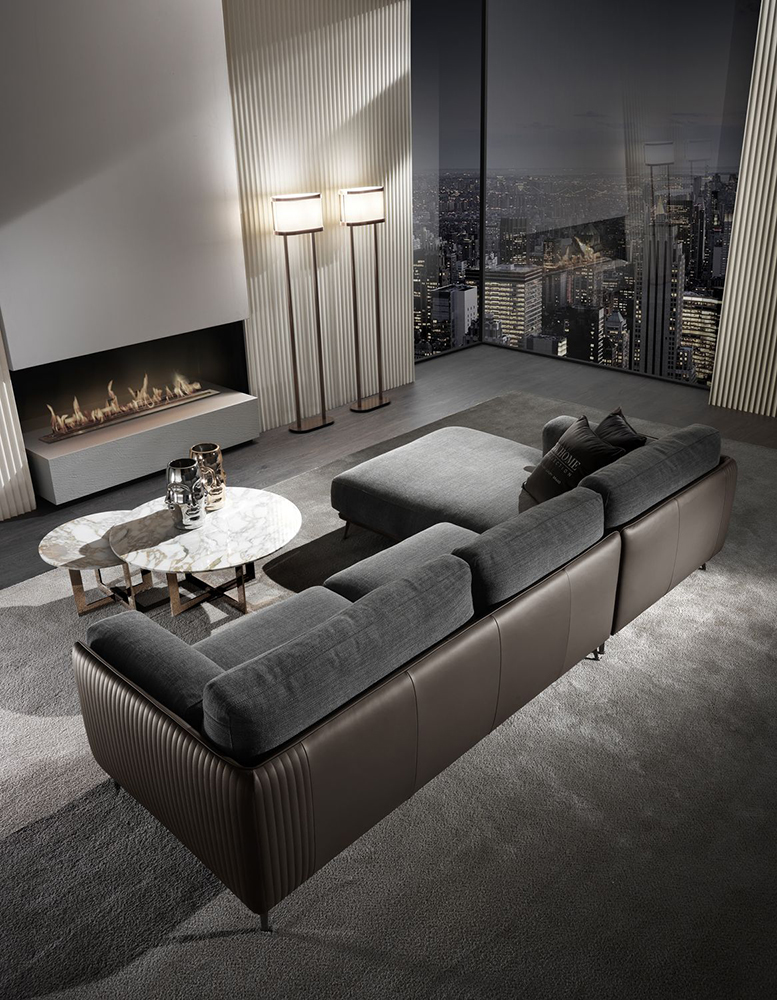 Corner sofa Elite - a modern sofa has rounded shapes and strong metal supports. The back is upholstered in leather and the armrests have decorative stitching, which gives an elegant look.