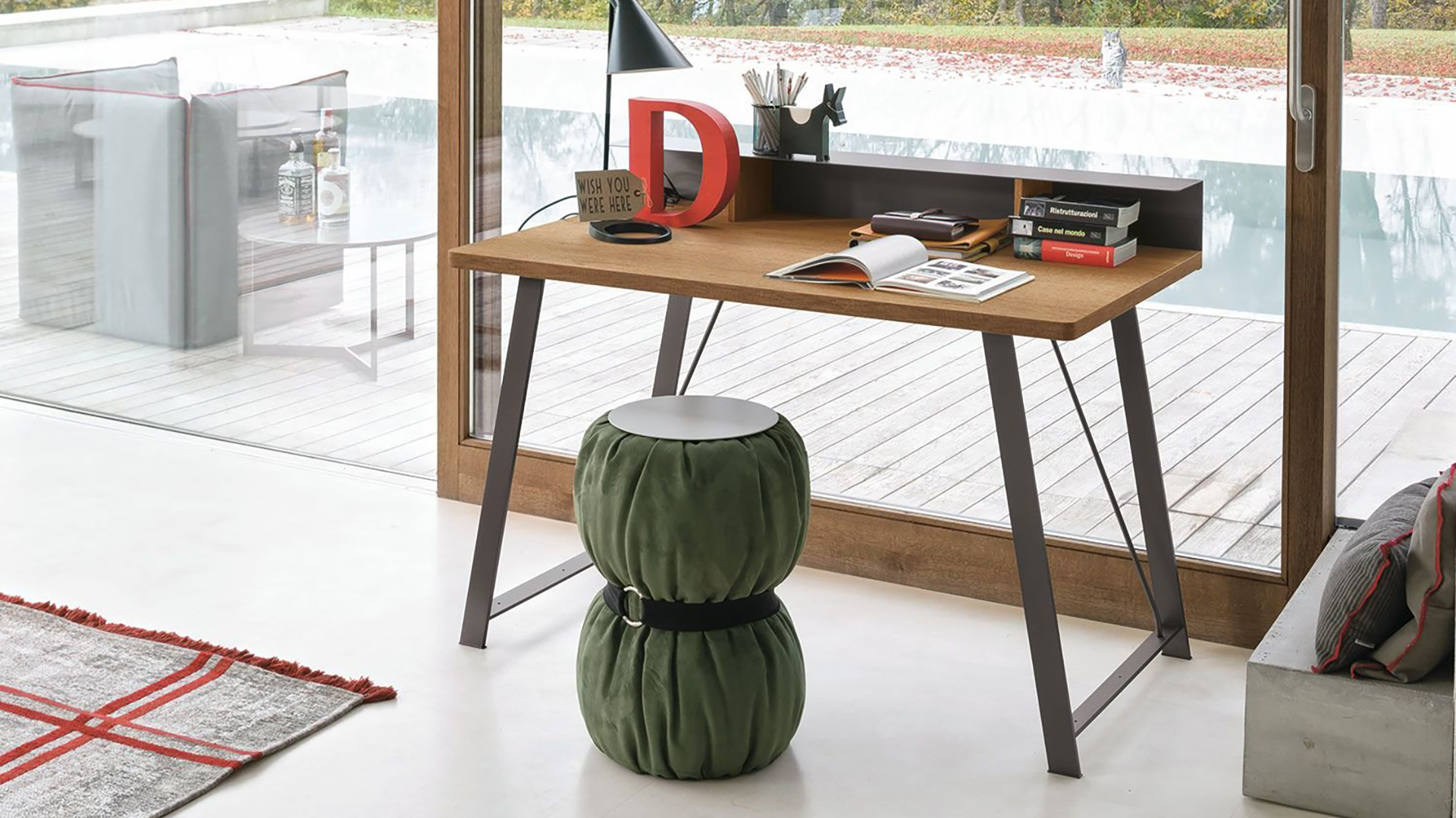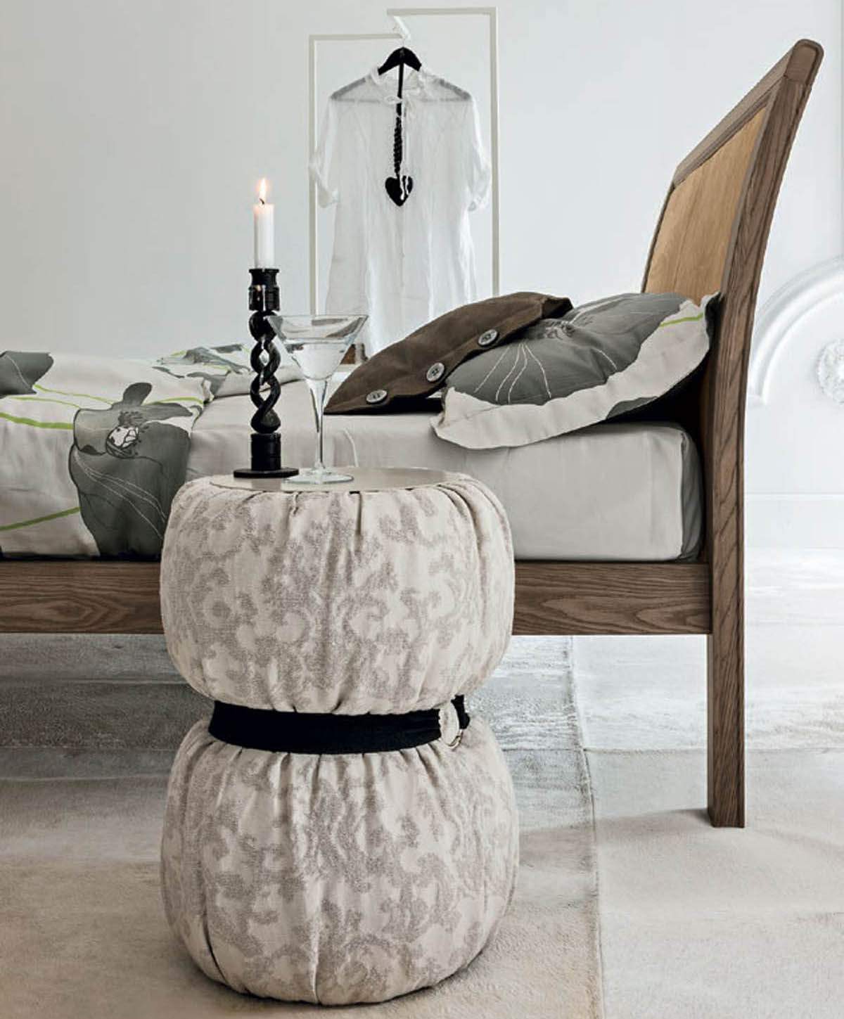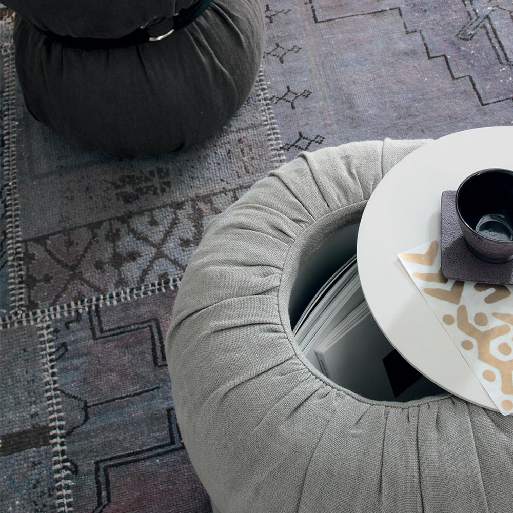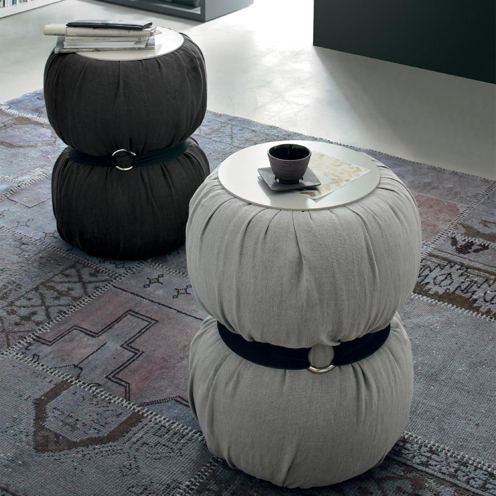 Occasional table upholstered in fabric with matt lacquer top.