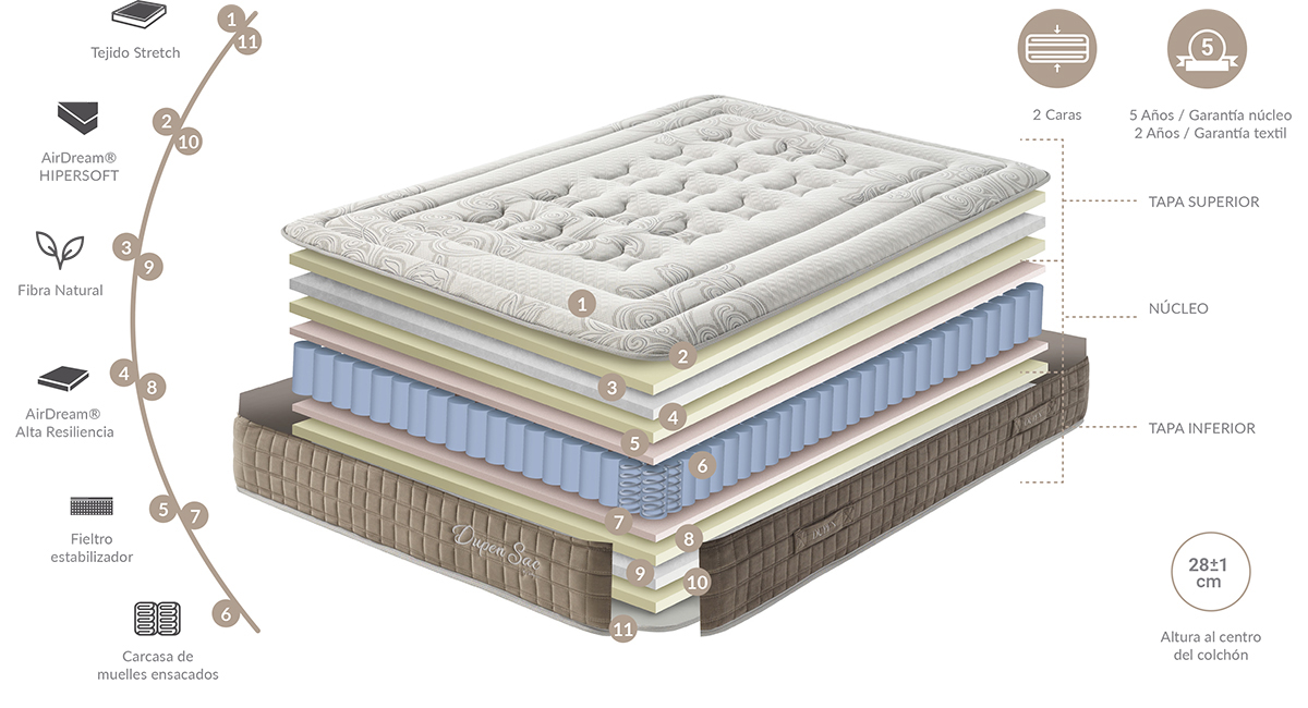 Ներքնակը հիմնված է անկախ զսպանակների բլոկի վրա, կողքերին ընկած են Memory Foam-ի շերտերը: Լցված է հիպոալերգենային շնչառական գործվածքով ալոէ վերայով և հագեցած օդային փականներով ներքին օդափոխության համար: Կարված է բացառիկ «Դելյուքս» կարով; Կողքերում կան բռնակներ՝ ներքնակն ավելի հեշտ շրջելու համար։