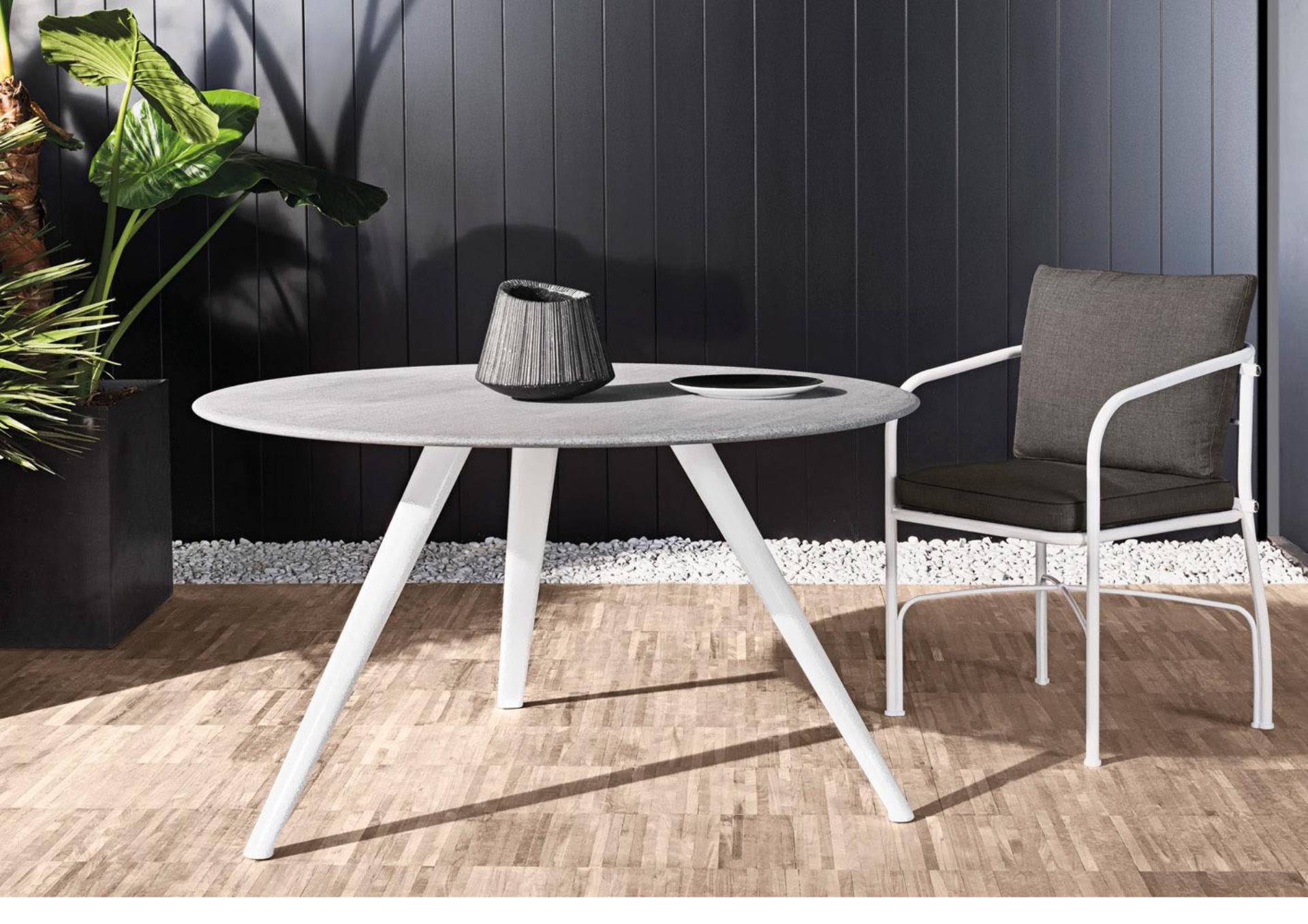 Արտաքինով պարզ, բայց տեխնոլոգիայով բարդ՝ սա Evans-ի սեղանների բացառիկ առանձնահատկությունն է: Այս շարքը հասանելի է նաև բացօթյա տարբերակով։ Ոտքերը պատրաստված են ձուլածո ալյումինից և ունեն կոնաձև գիծ: Նրանք ներկված են սպիտակ գույնի մուրճի էֆեկտով: Վերնամասը ունի 125 սմ տրամագիծ և պատրաստված է Silver Beola քարից։