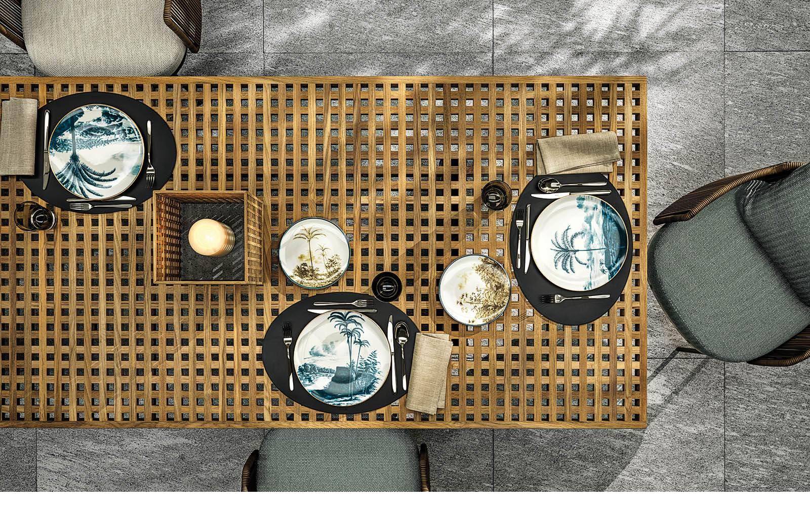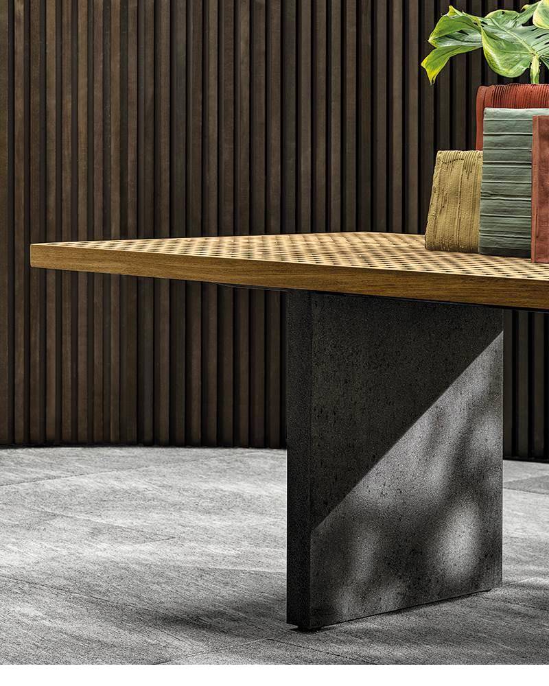 Ռացիոնալ, մինիմալիստական, նախագծված տարբեր նյութերի և հյուսվածքների համադրմամբ, սեղանն ունի Quadrado ընտանիքի տարբերակիչ տարր՝ շերտավոր ձողերի կառուցվածք: