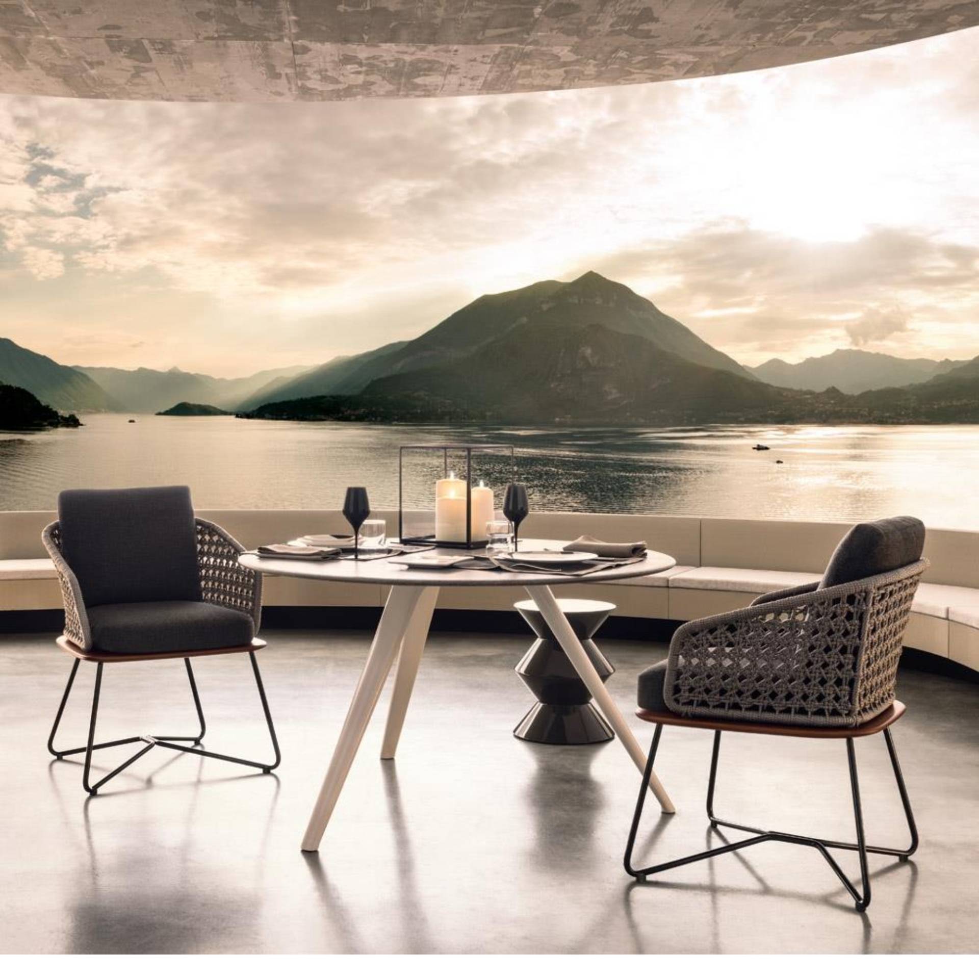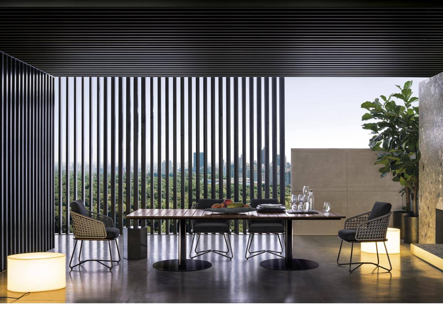 Rivera աթոռն իր կոմպակտ դիզայնով և նրբագեղ գծերով մարմնավորում է նախագծի բոլոր գեղագիտական ​​արժեքները և նյութերի կատարյալ համադրությունը: Այն հենված է պտտվող անագի գույնի խողովակաձև մետաղական կառուցվածքի վրա, որը հատուկ մշակված է բացօթյա օգտագործման համար, ինչպես նաև անջրանցիկ մանրաթելով ծածկված փափուկ բարձիկների համար նախատեսված լցոնման նյութերը: