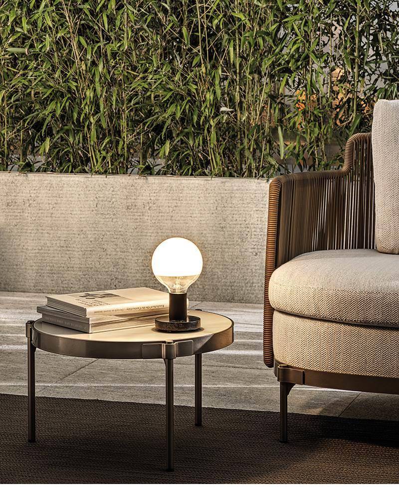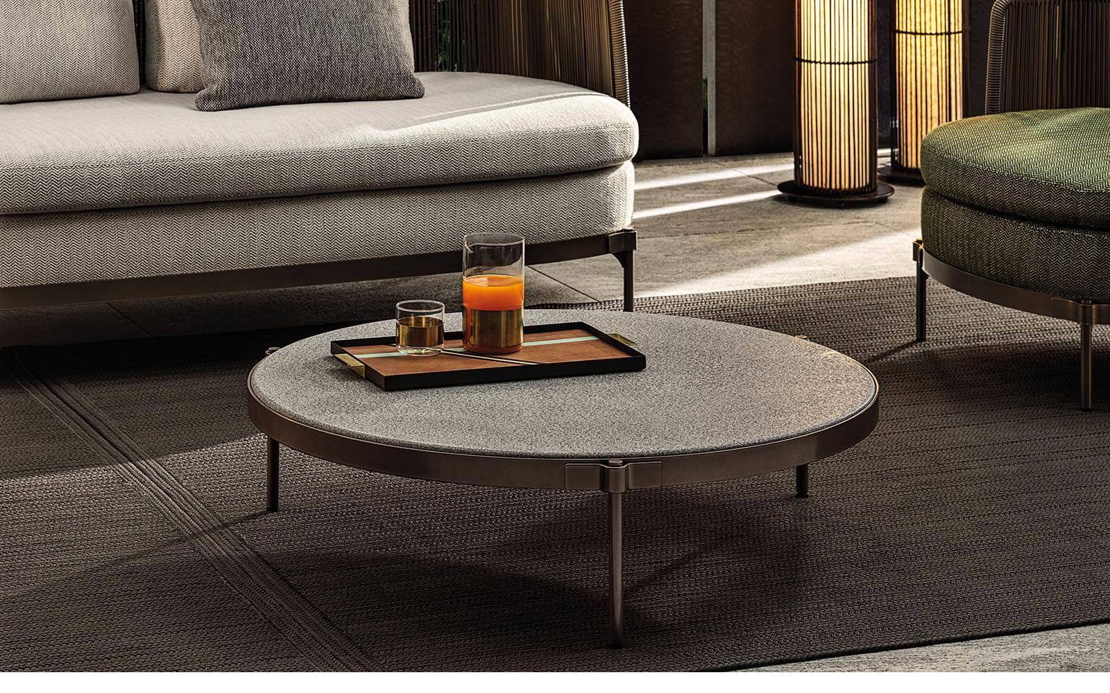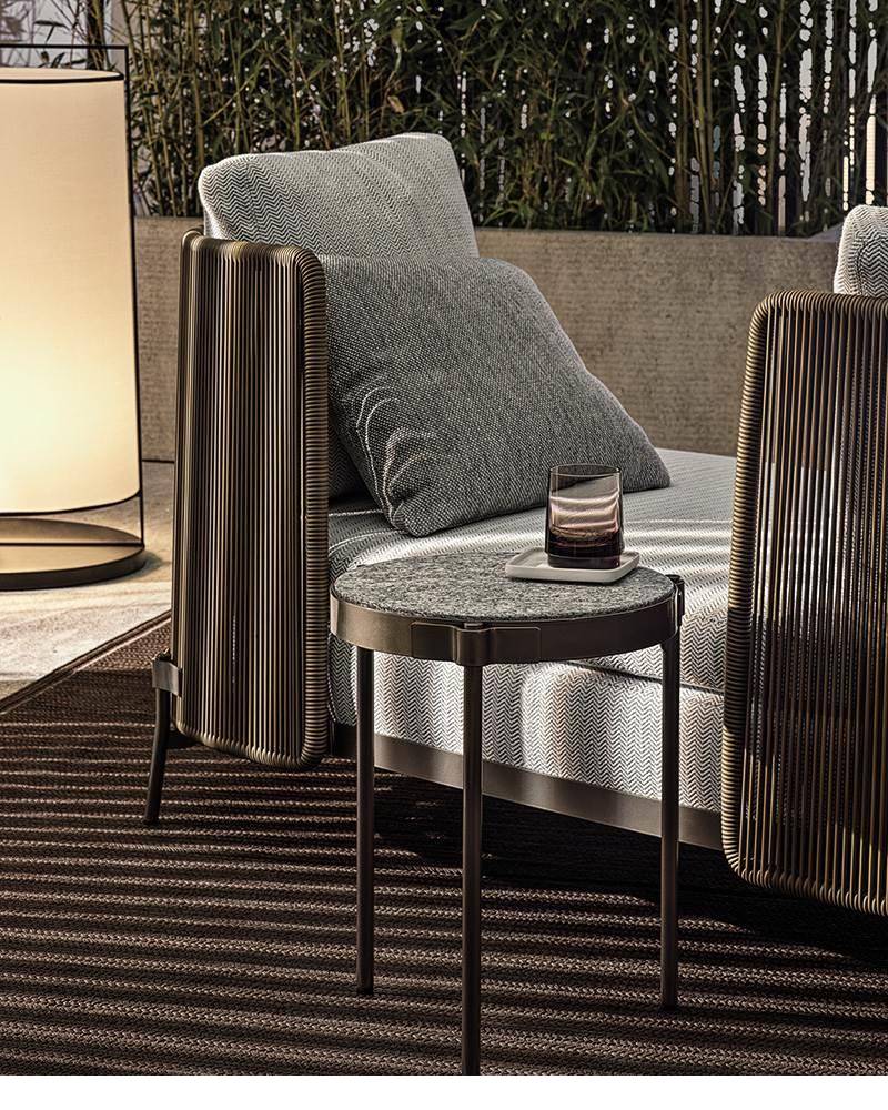 Թեթև բրոնզե ծածկույթով մետաղից փոքր սեղանների գաղափարը ոգեշնչված է Tape-ի բնորոշ դետալից, որը էսթետիկորեն ամրացնում է ոտքերը թագին, որի ներսում տեղադրված է Silver Beola կամ Corian EC վերնամասը: