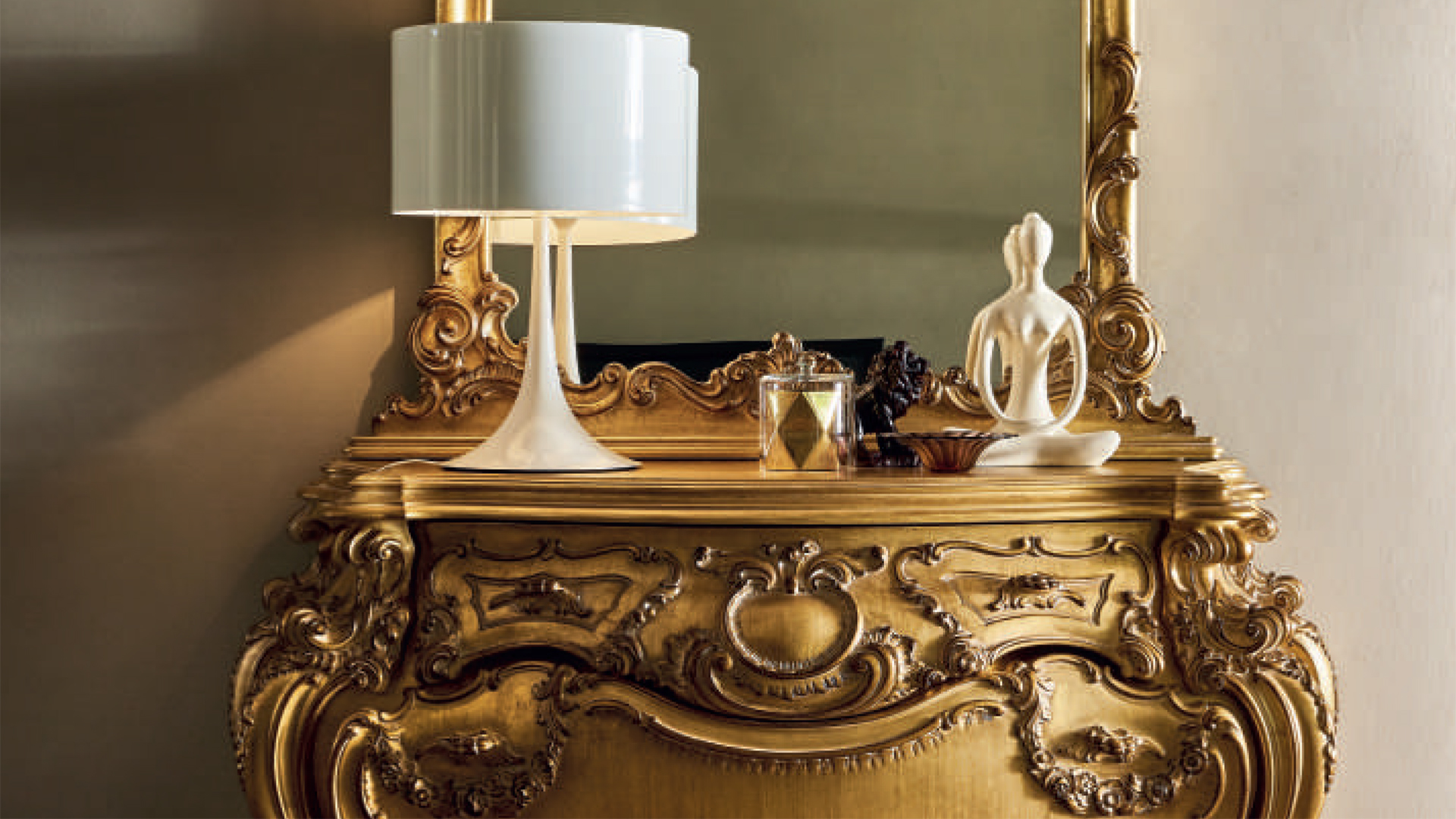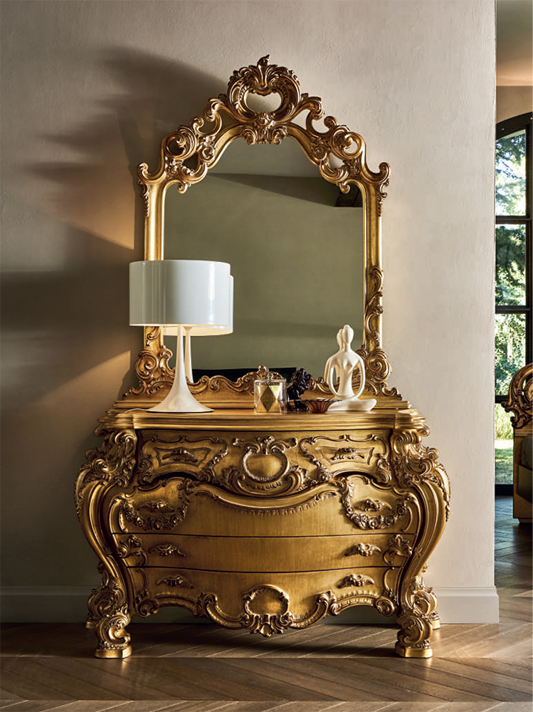 Պատկերավոր կոմոդ 4 դարակով։ Փայտե սեղան ապակե մակերեսով։ Դեկոր - պոլիուրեթանային փրփուր: Հնարավոր են այլ լուծումներ: Հայելին պատվիրվում է առանձին։