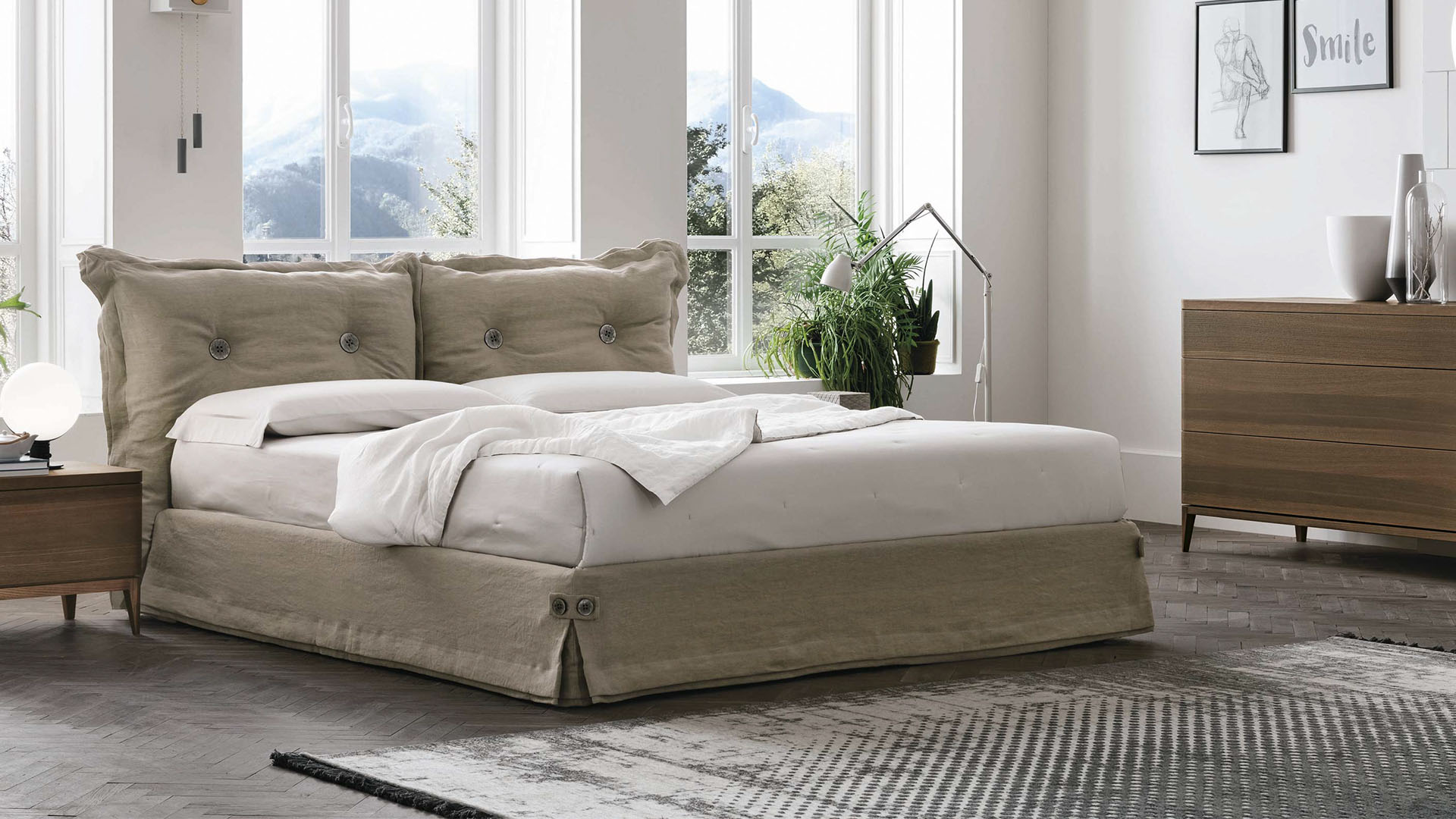 Կտորապատ մահճակալ։ Արտաքին տարրերը՝ կտորածածկ։ Հասանելի է պահոցով տարբերակը։ Արհեստական կաշվե պաստառապատումը խորհուրդ չի տրվում։