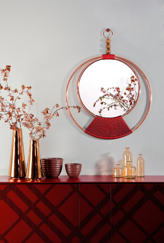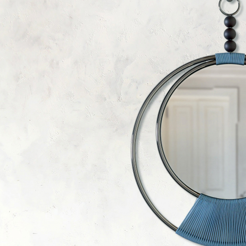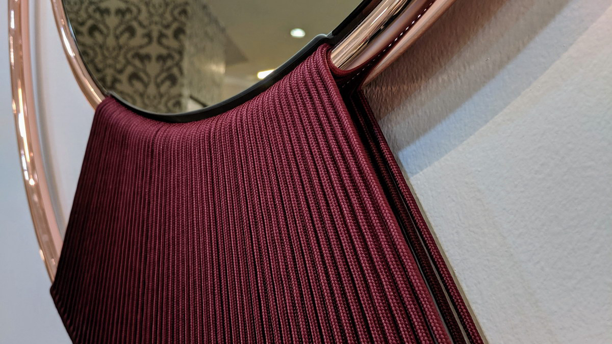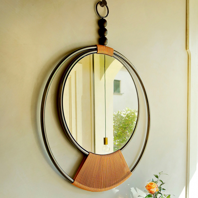 Նուրբ հյուսված գործվածքները, որոնք հմուտ ձեռքի աշխատանք են, ապահովում են հայելային մակերեսը բրոնզե կամ մոխրագույն ծածկույթներով: Քրոմապատ մետաղական կոնստրուկցիան՝ հայելու մակերեսի պաշտպանիչ շրջանակը, ձևավորում է թեթև և ժամանակակից ձև, որը լրացվում է պինդ փայտի երեք մասերով: Կախազարդ, որը յուրաքանչյուր պատին դարձնում է անմոռանալի։