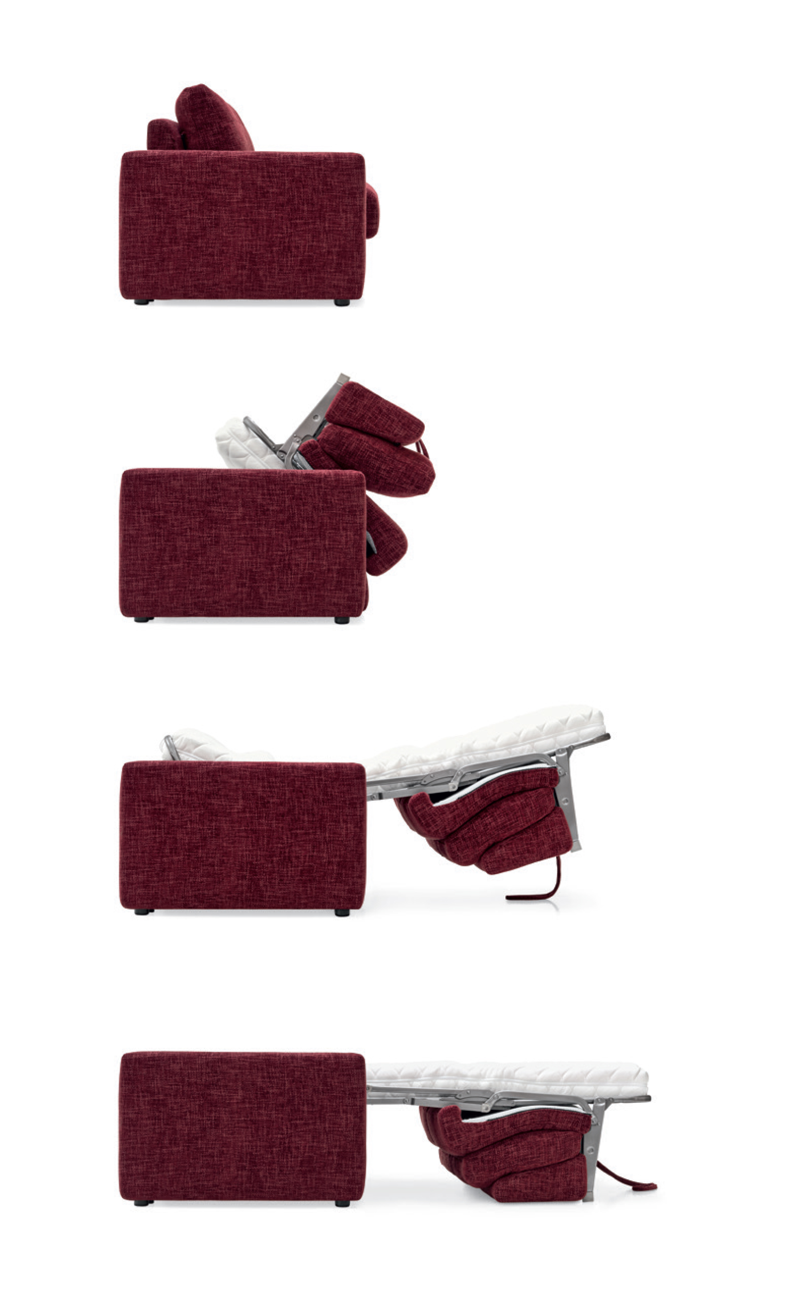 Convert — чрезвычайно универсальный диван: он предлагает подлокотники разных размеров, не столько для создания разных вкусовых зон, сколько для оптимизации пространства комнаты. Он оснащен полуавтоматическим механизмом, а матрас входит в комплект. Легко открывается: потяните за ленту, которая соответствует чехлу и спрятана в спинке; она закрывается с такой же легкостью, без необходимости перемещать подушки или что-либо еще.