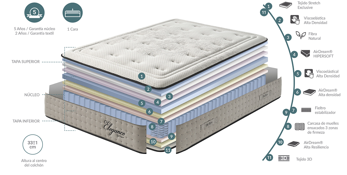 Матрас с сердечником из блоков независимых пружин, на одной стороне оснащён слоем Memory Foam. Новейшая обивка - “золотой люрекс”, которая представляет из себя 3D ткань с Memory Foam, простроченную позолоченными нитями. Матрас выглядит дорого и очень эффектно, а кроме того даёт приятные тактильные ощущения.