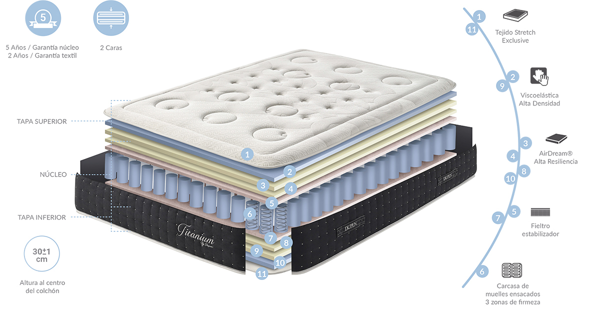 Матрас с сердечником из блоков независимых пружин. С обеих сторон сердечника находятся слои Memory Foam высокой плотности. Обит дышащей гипоаллергенной тканью с алоэ Вера, а также оснащён воздушными клапанами для лучшей внутренней вентиляции.