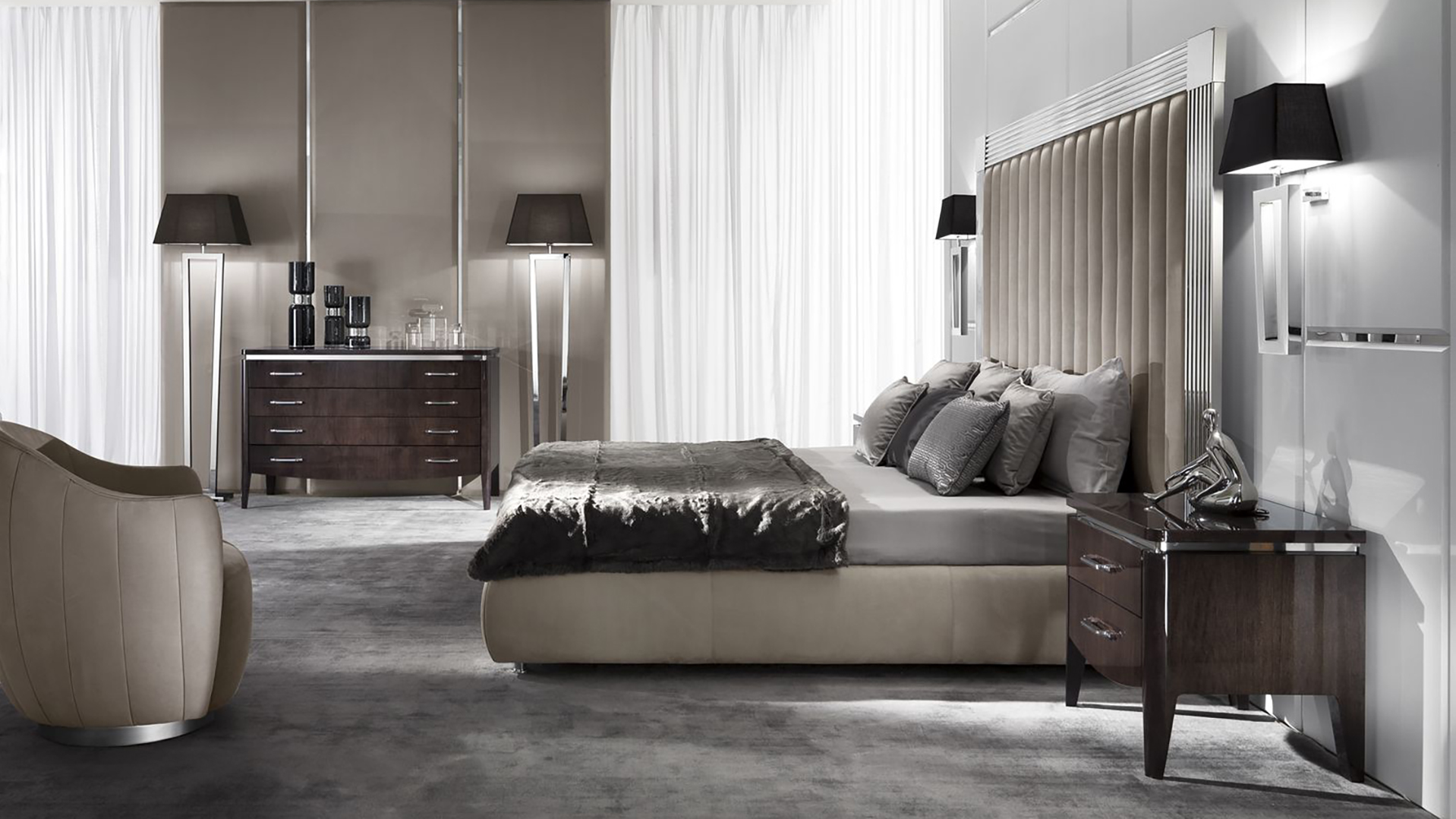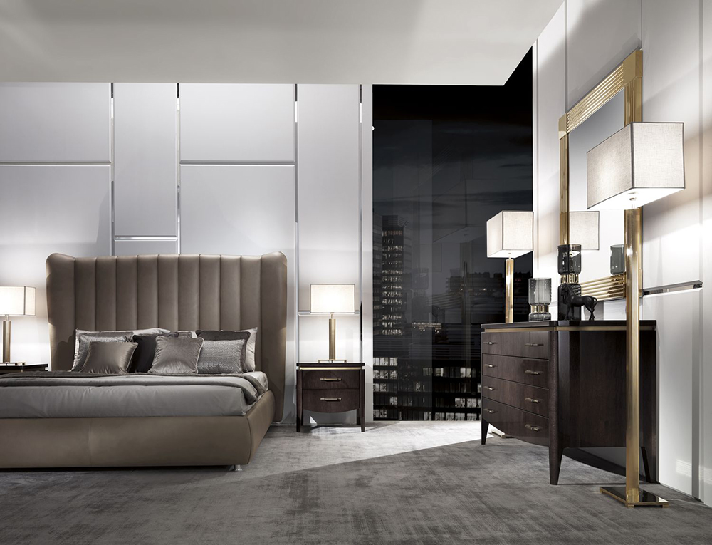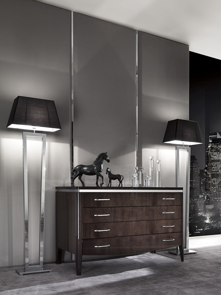 Комод с четырьмя выдвижными ящиками. Каркас выполнен из древесины и нержавеющей стали. Возможны разные варианты отделки.