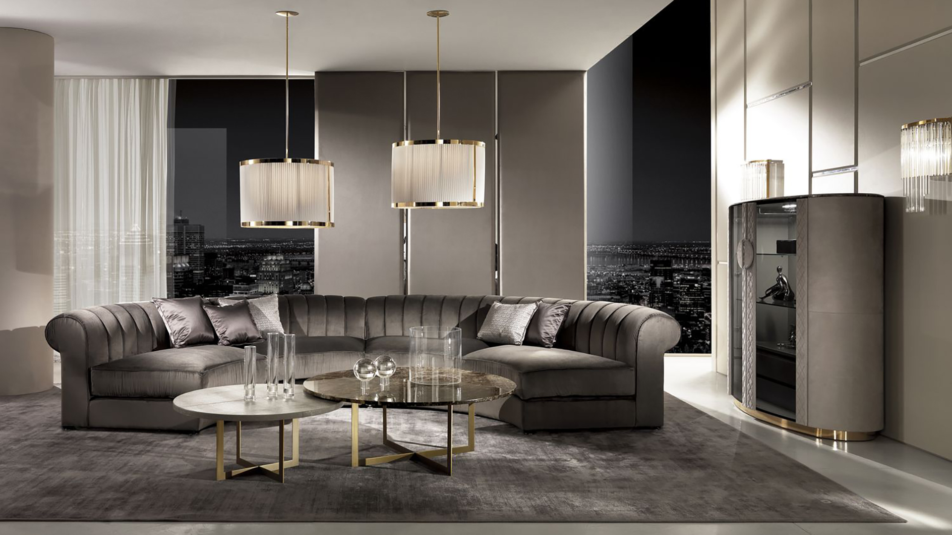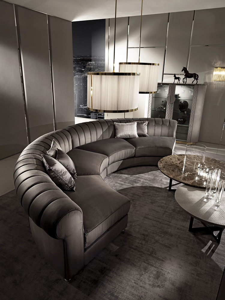 Полукруглый диван на хромированном основании. Каркас состоит из древесины и полиуретана. Подушки на сидении и спинке набиты гусиным пухом. Возможны разные варианты обивки.