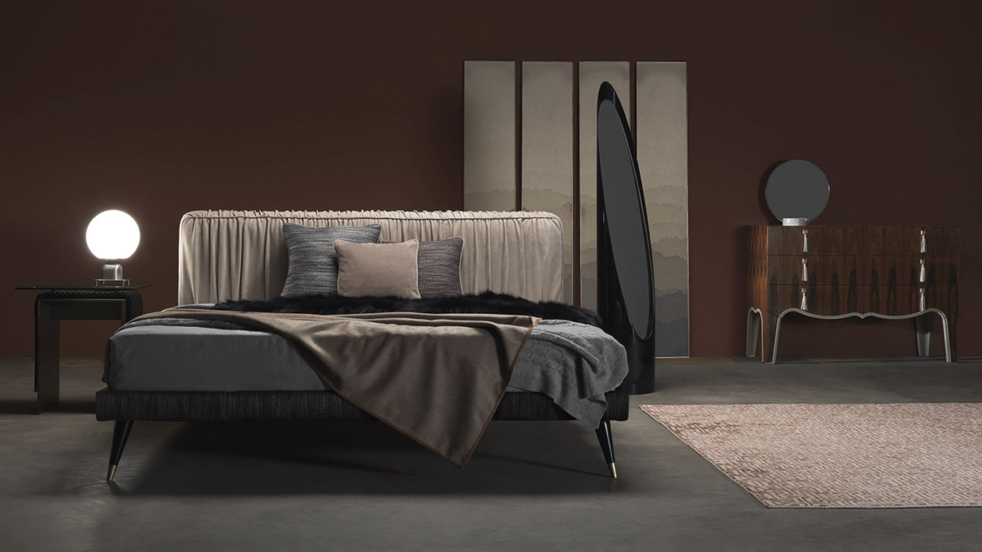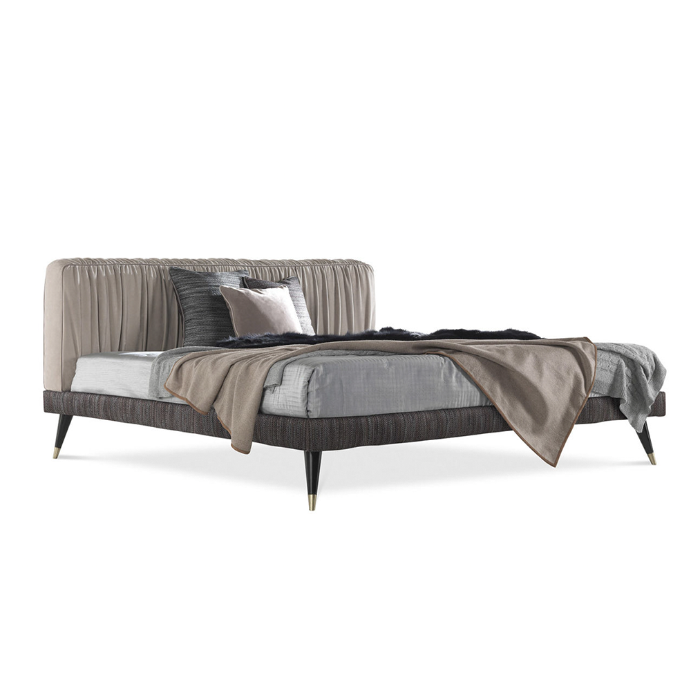 Изысканная плиссировка изголовья, элемент, свидетельствующий о портняжном мастерстве бренда Gianfranco Ferré Home, является отличительной чертой кровати Highlander, украшенной ножками с бронзовыми деревянными наконечниками.