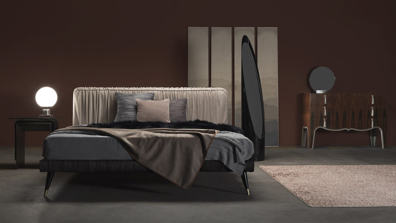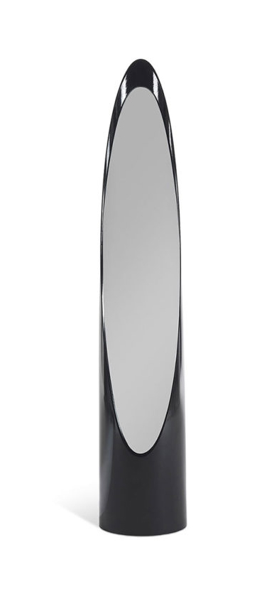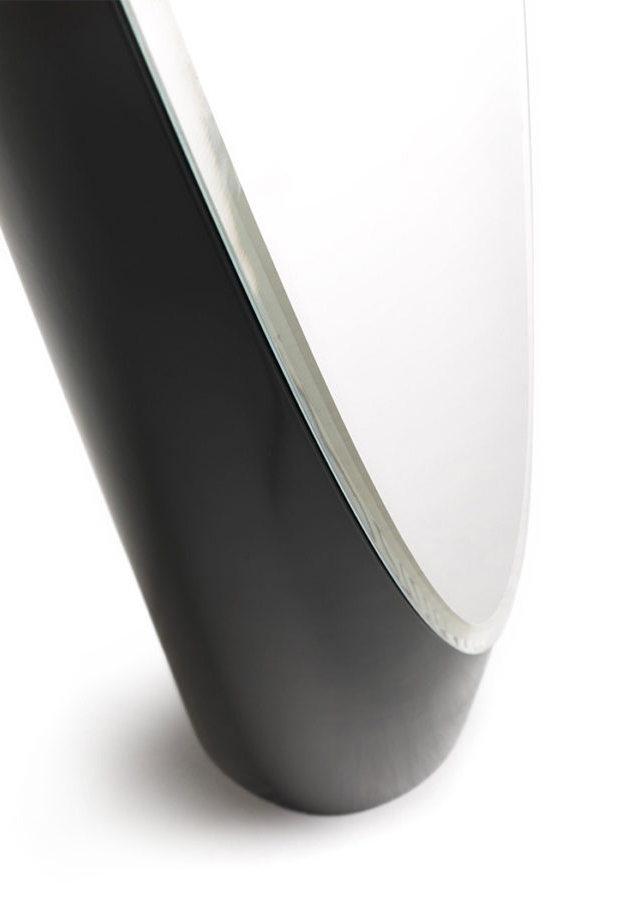 Напольное зеркало с фаской в структуре из черного лакированного дерева. Прозрачное зеркало с фацетом.