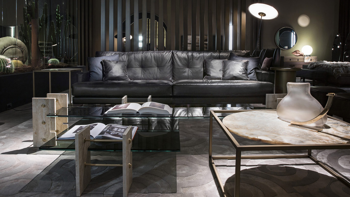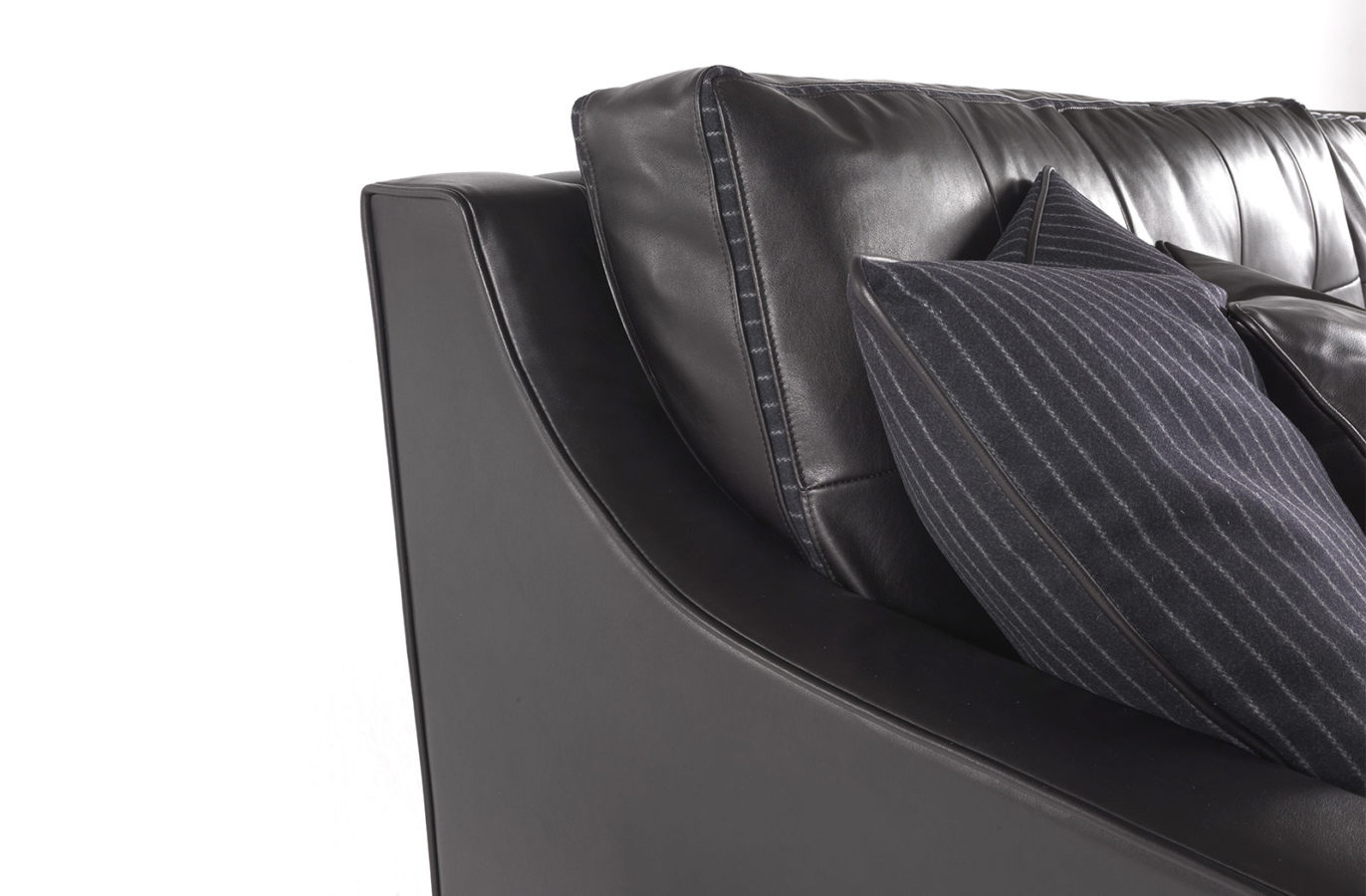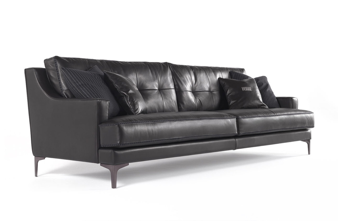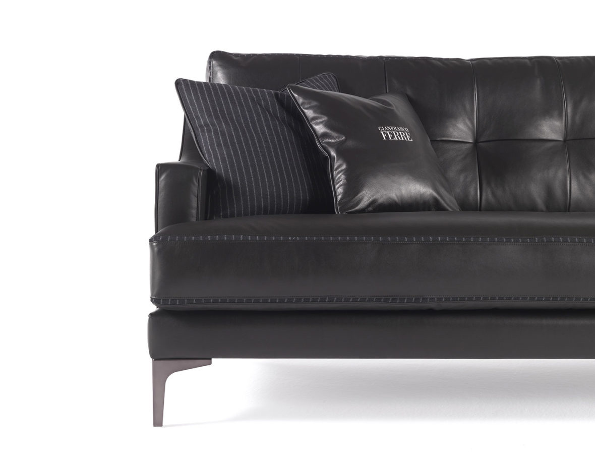 Трехместный диван со структурой из бука и пены. Обивка из натуральной кожи. Двойная окантовка и вставка из ткани. Основа из металла с отделкой из черного хрома.