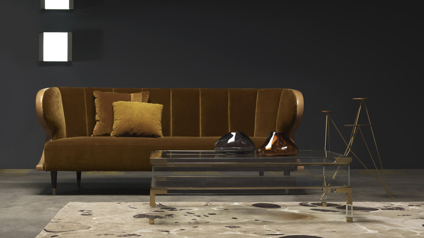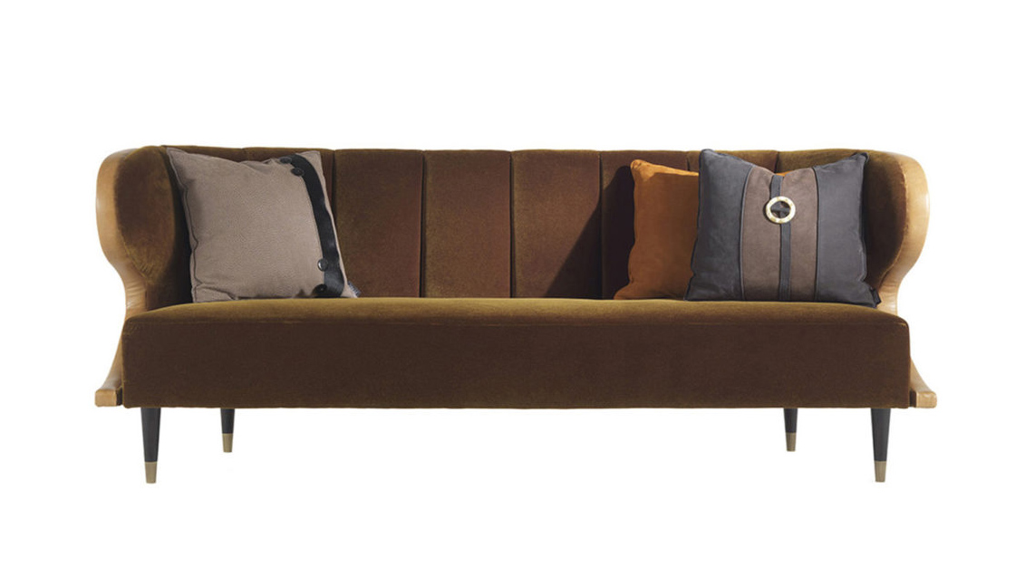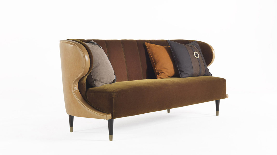 Трехместный диван, идеально подходящий для зоны чтения в спальной зоне. Структура из бука и пены. Обивка комбинированная – бархат и кожа. Ножки в латунной отделке бронзового цвета.