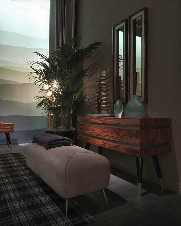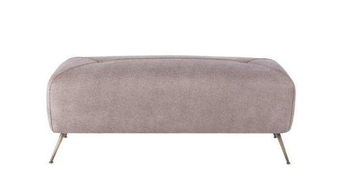 Универсальный и оригинальный пуф-скамья Rowe с латунными ножками. Обивка плиссированная из толстого бархата с сильной геометрической игрой, возникающей в результате сочетания трапециевидных форм. Структура из бука и пены. Ножки с бронзовой латунной отделкой.