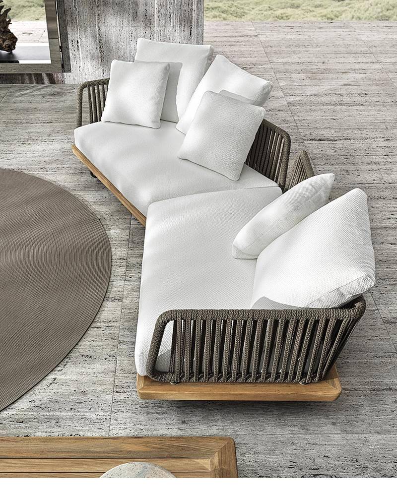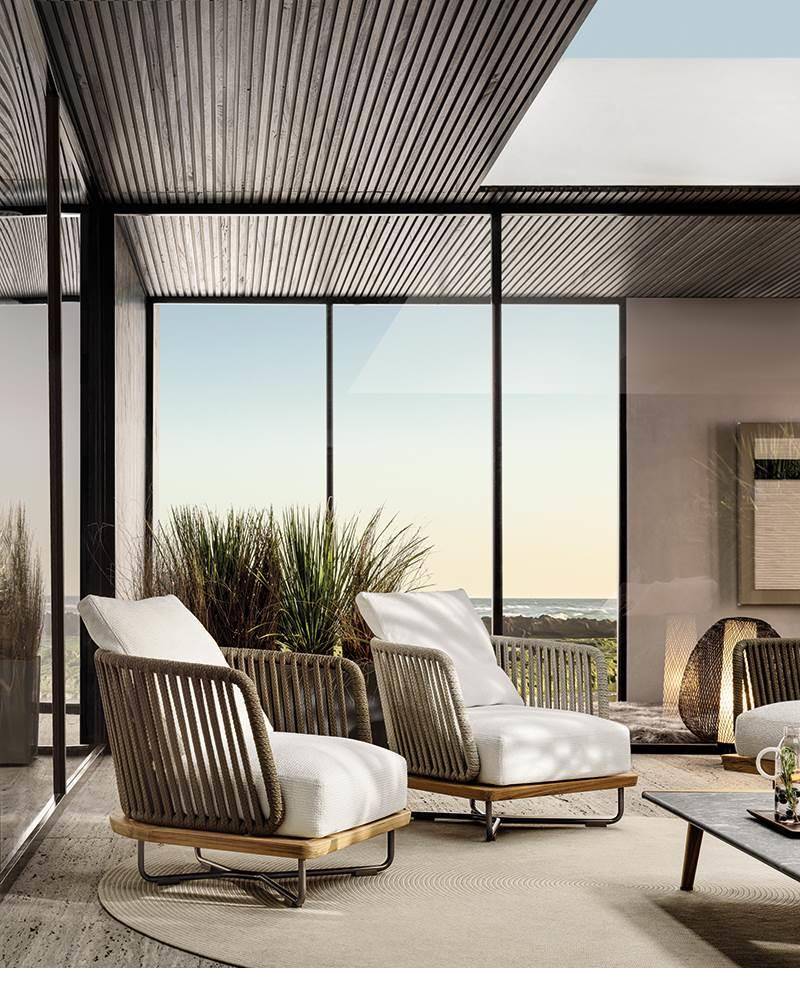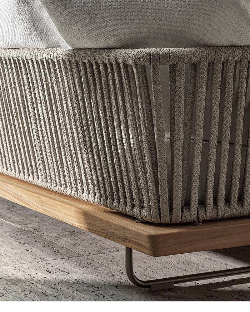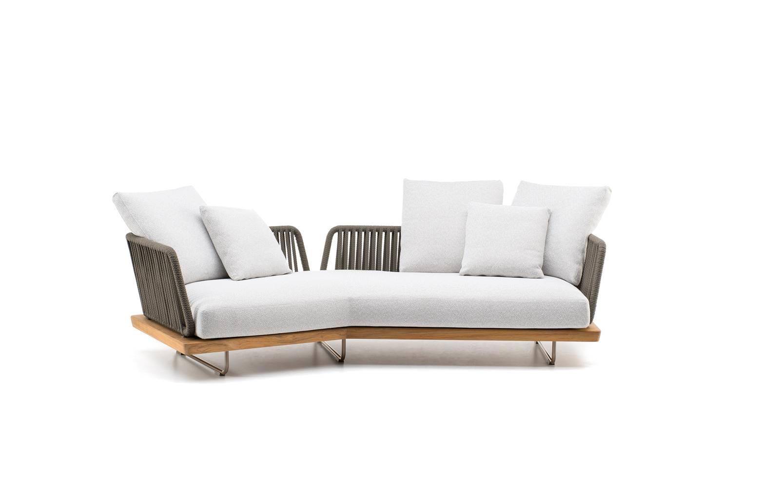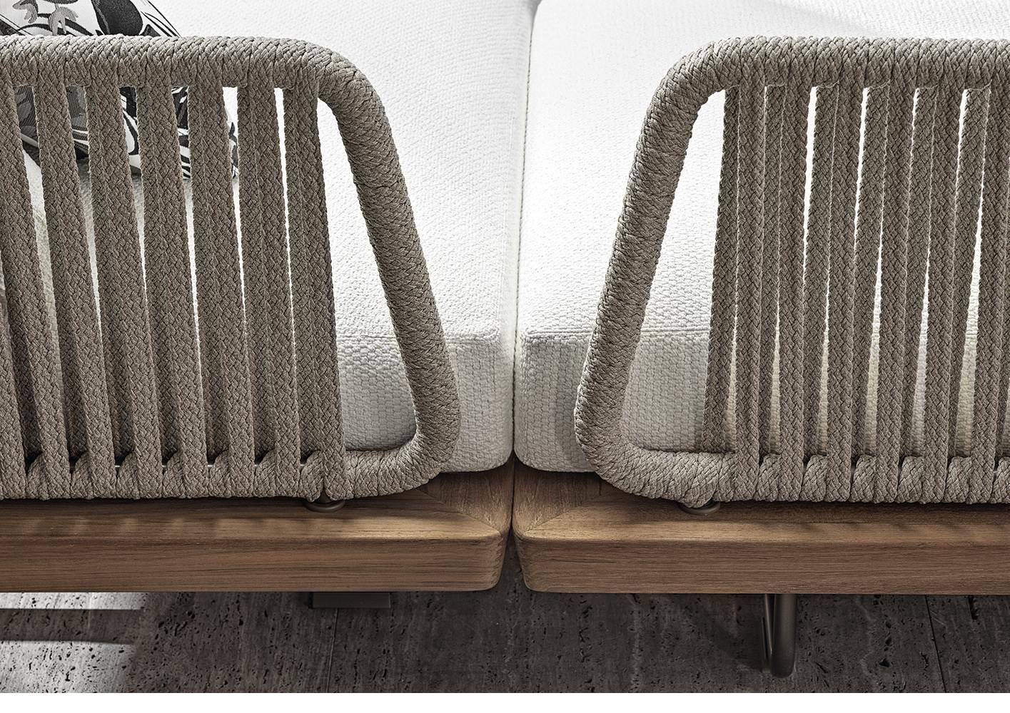 Он сочетает в себе различные формы и материалы: его воздушная поверхность из натурального тикового дерева определяет его горизонтальную линию, а изогнутая спинка с переплетенными шнурами придает ему динамичное очарование.