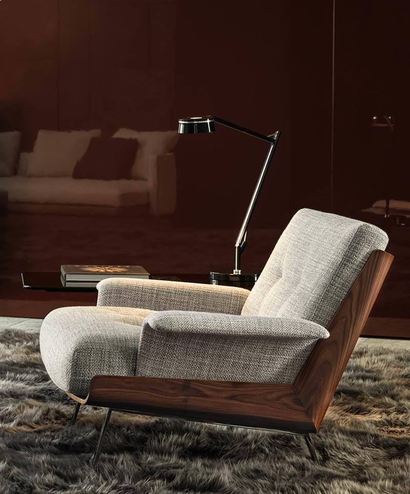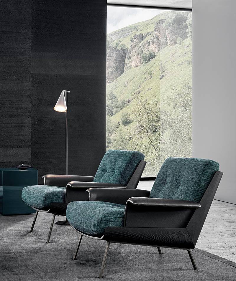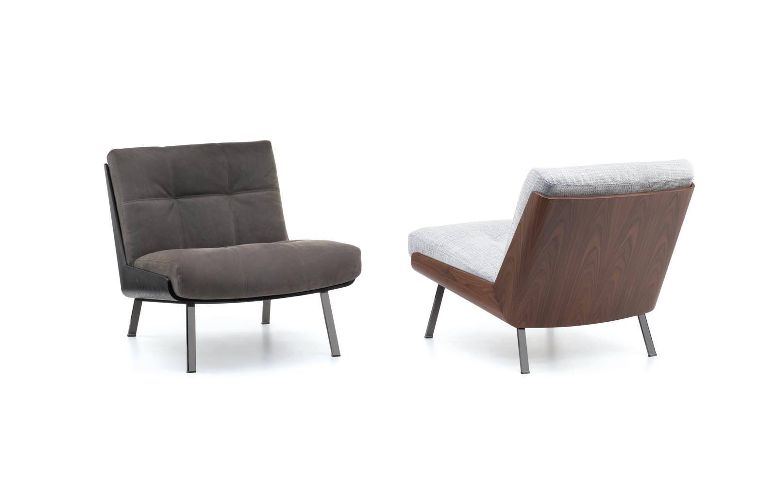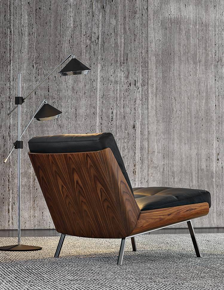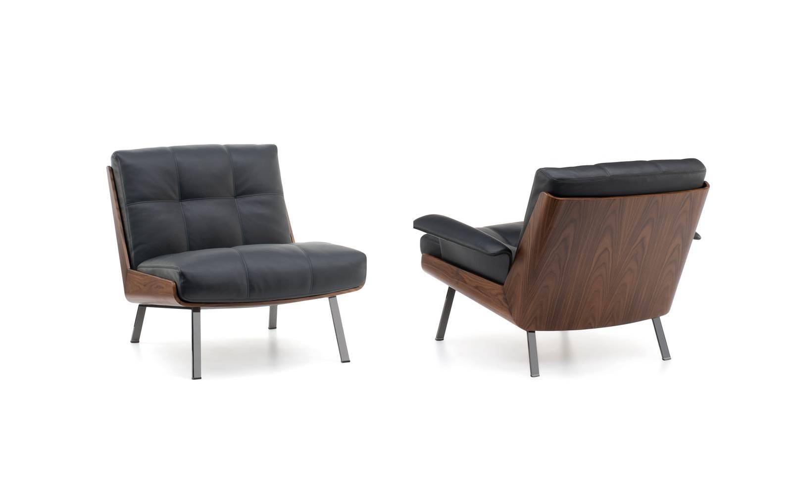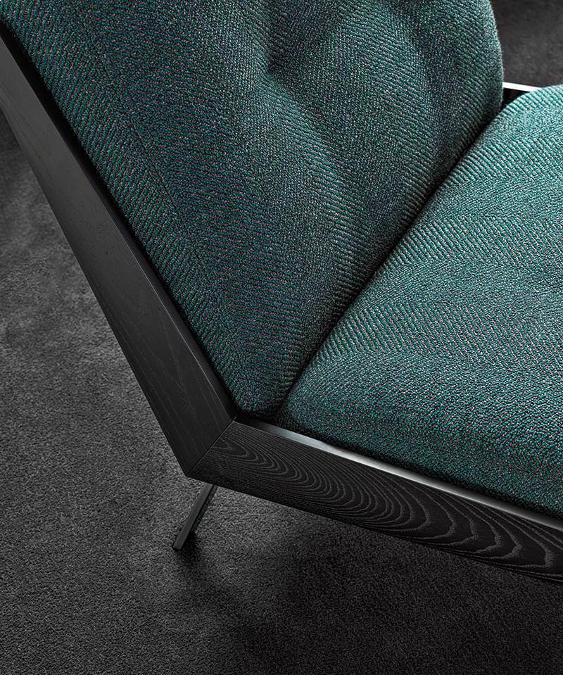 Кресло Daiki сочетает в себе утончённость и геометрию японского дизайна с эстетикой mid-century modern, отражённой в простоте и чёткости его линий и сбалансированных пропорциях. Созданный с использованием сложных технологий обработки дерева, изогнутый корпус состоит из двух элементов, соединенных под углом 45°, с наклонной спинкой, гарантирующей максимальный комфорт. Корпус из палисандра Santos или обожженного ясеня с лаковым покрытием цвета Liquorice обеспечивает плотное прилегание к подушкам и установлен на металлическом каркасе с ножками с отделкой Black-Nickel. В версии с кожаной обивкой подушки простеганы с прострочкой, а в тканевой — только с прострочкой.