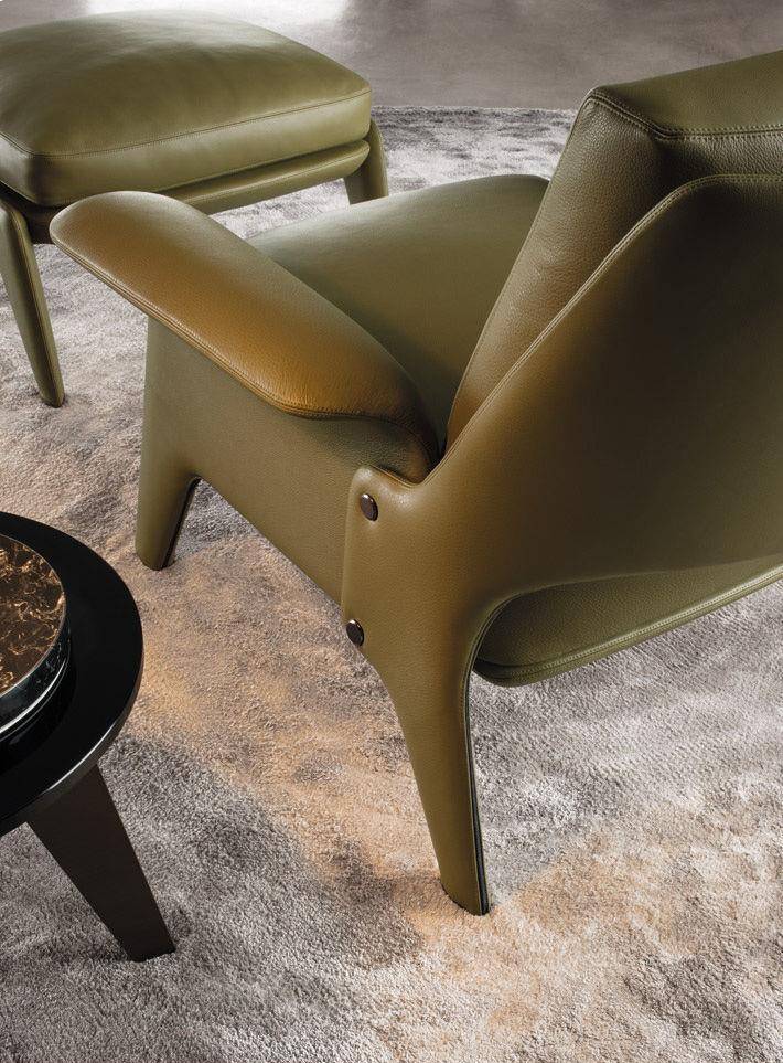 Кресло Glover отличается элегантным дизайном и превосходным удобством. Сбоку имеется необычное соединение между спинкой и подлокотником, дополненное заклепками из металла.