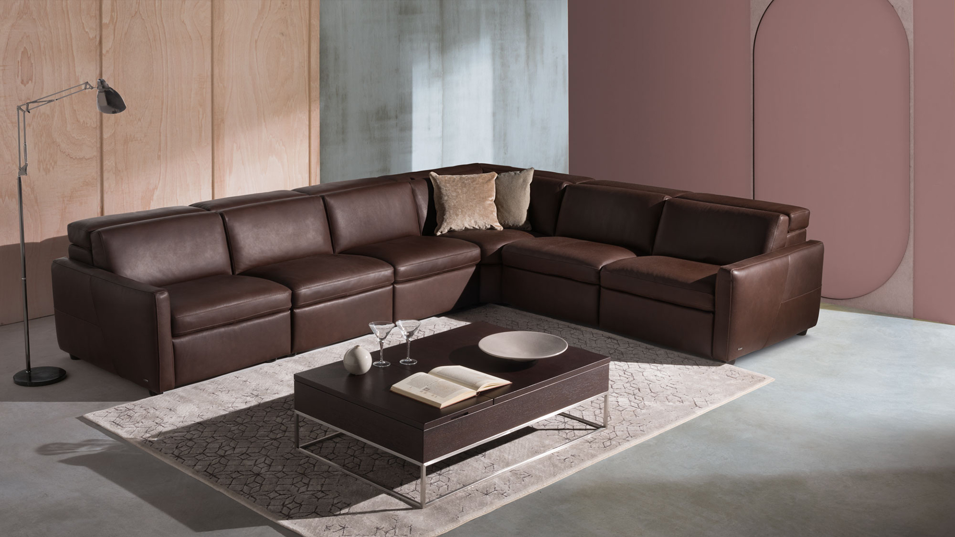 Natuzzi Splendore – угловой кожаный диван с электроприводом. Новая модель, недавно представленная Natuzzi, с тонкими и гладкими подлокотниками и регулируемым подголовником. Данная модель может поместиться в самых маленьких местах и отличается современным дизайном и комфортом.