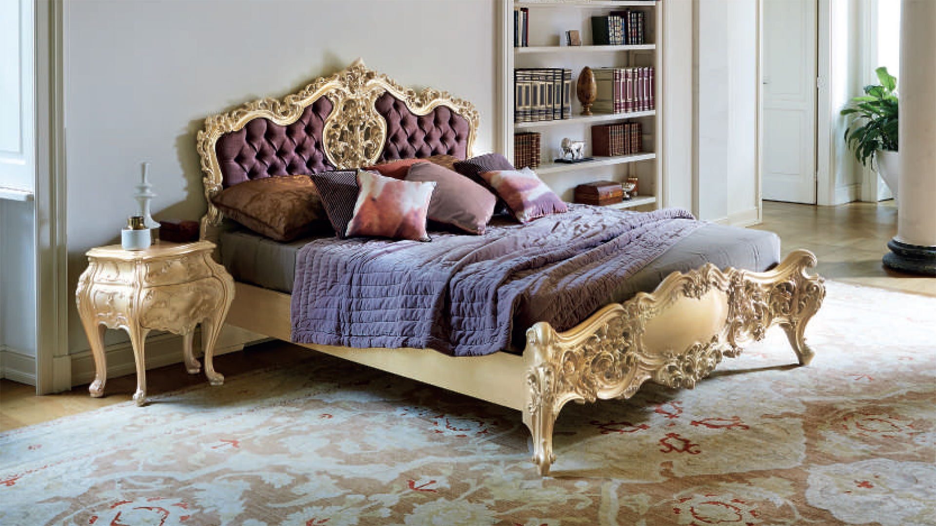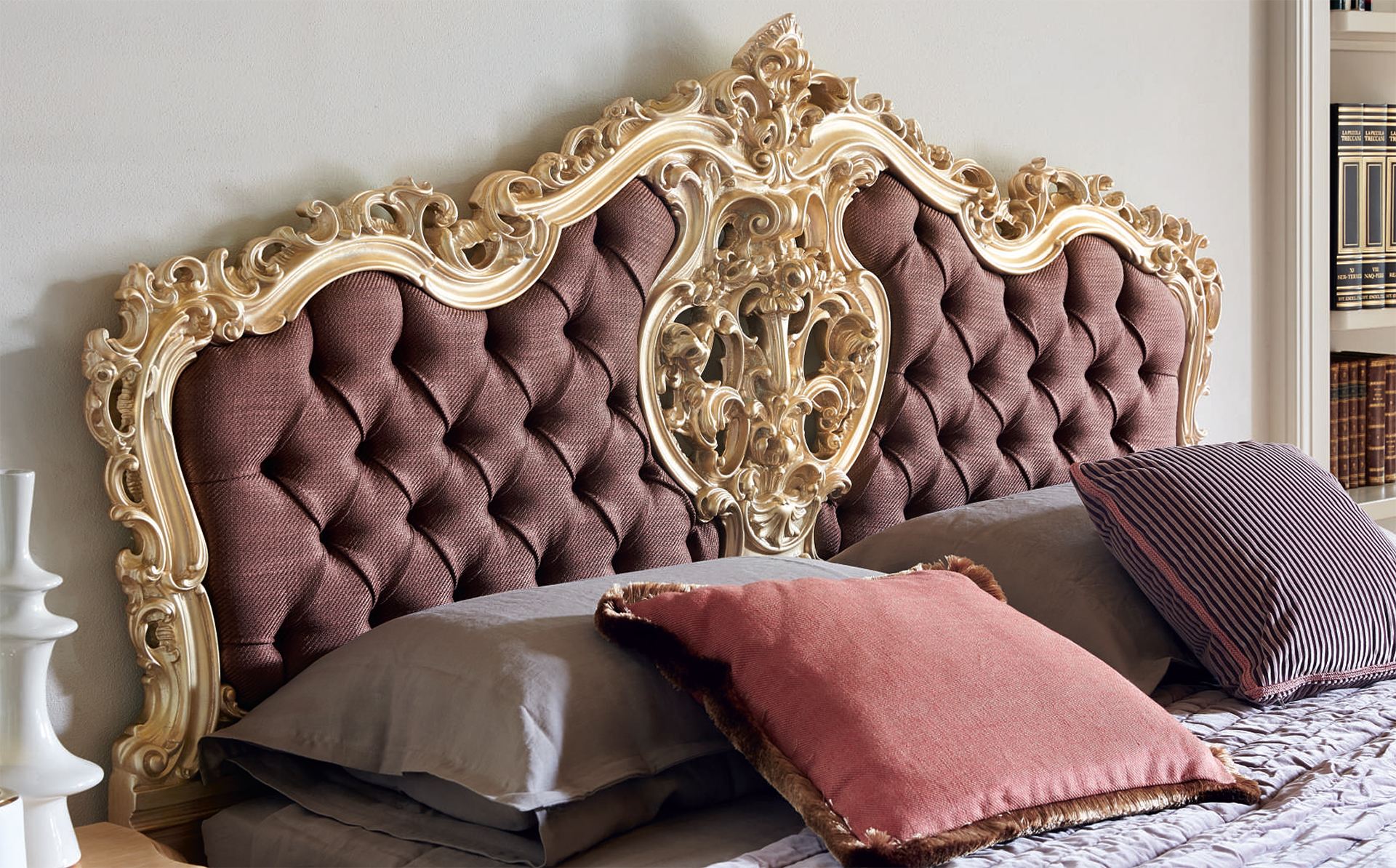 Двуспальная кровать с высоким мягким изголовьем, без изножья (возможен вариант кровати с изножьем). Декор - пенополиуретан, наполнение - полиуретан. Возможны другие варианты отделки и обивки.