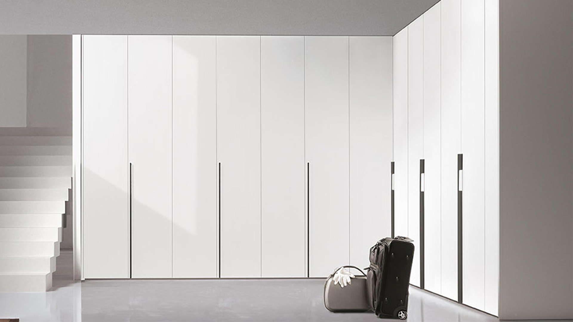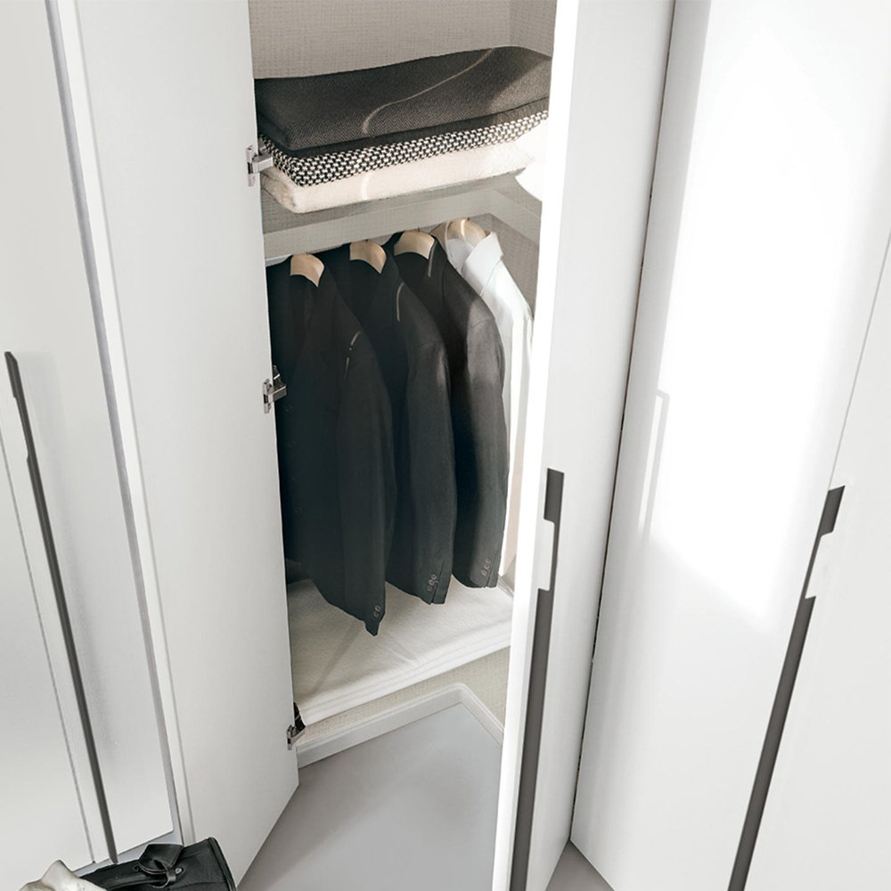Полностью используется весь угол. Две открывающиеся створки данного распашного шкафа обеспечивают свободный доступ в этот угловой модуль, оборудованный внутри удобной полкой, соответствующей его форме, и совершенно необходимыми трубчатыми планками для развешивания одежды.