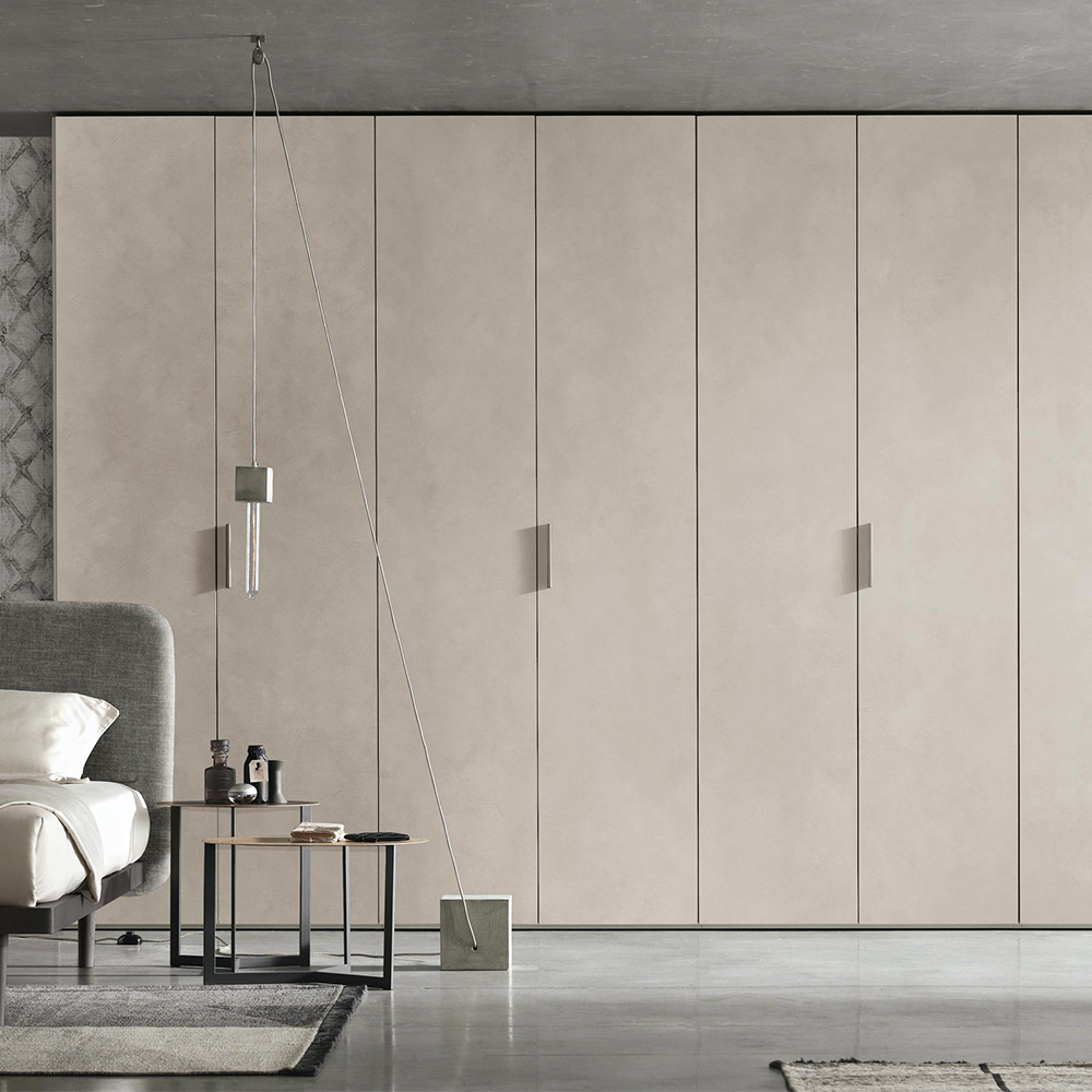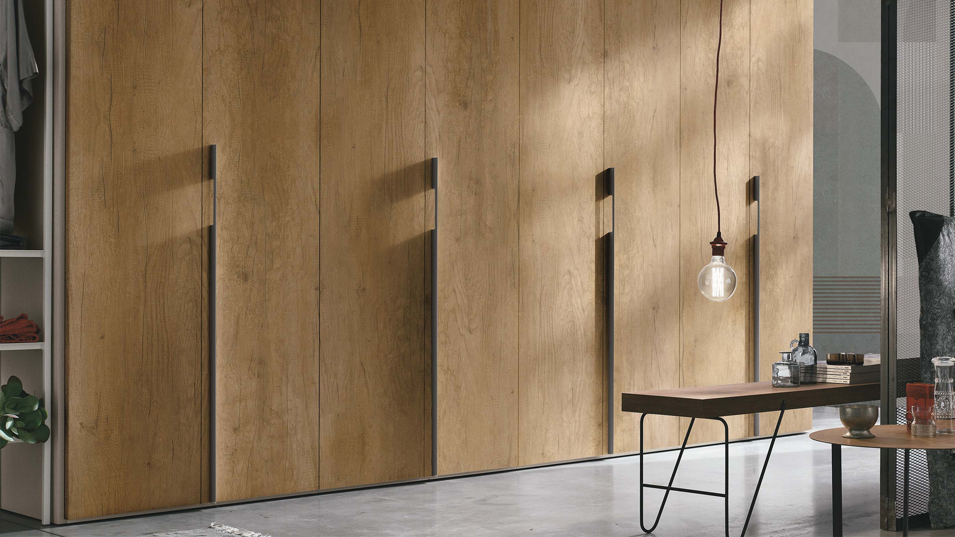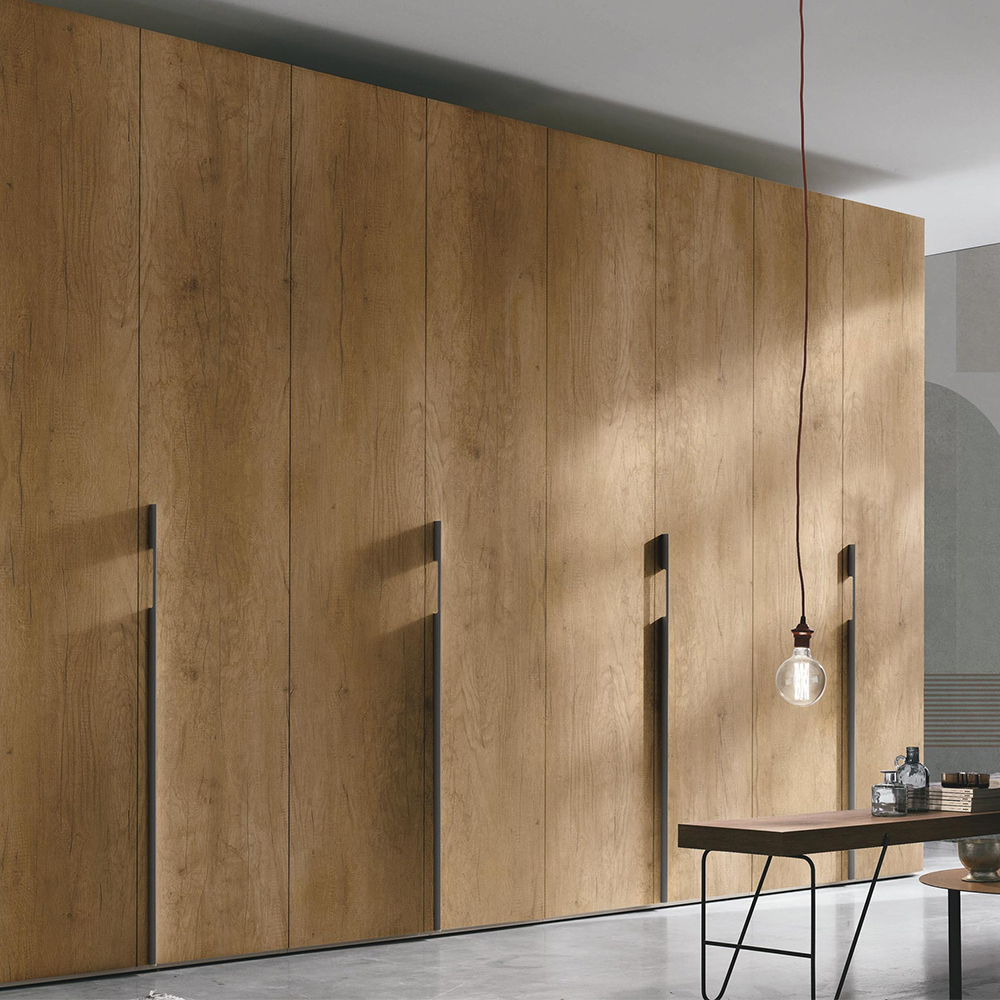 Гладкая створка, открывающая стилистический простор для модульных композиций с разными видами отделки, позволяет создавать неординарные и чрезвычайно самобытные решения и эффекты. Определяющую роль здесь играют расцветки дерева, лакировка и рельефные поверхности.