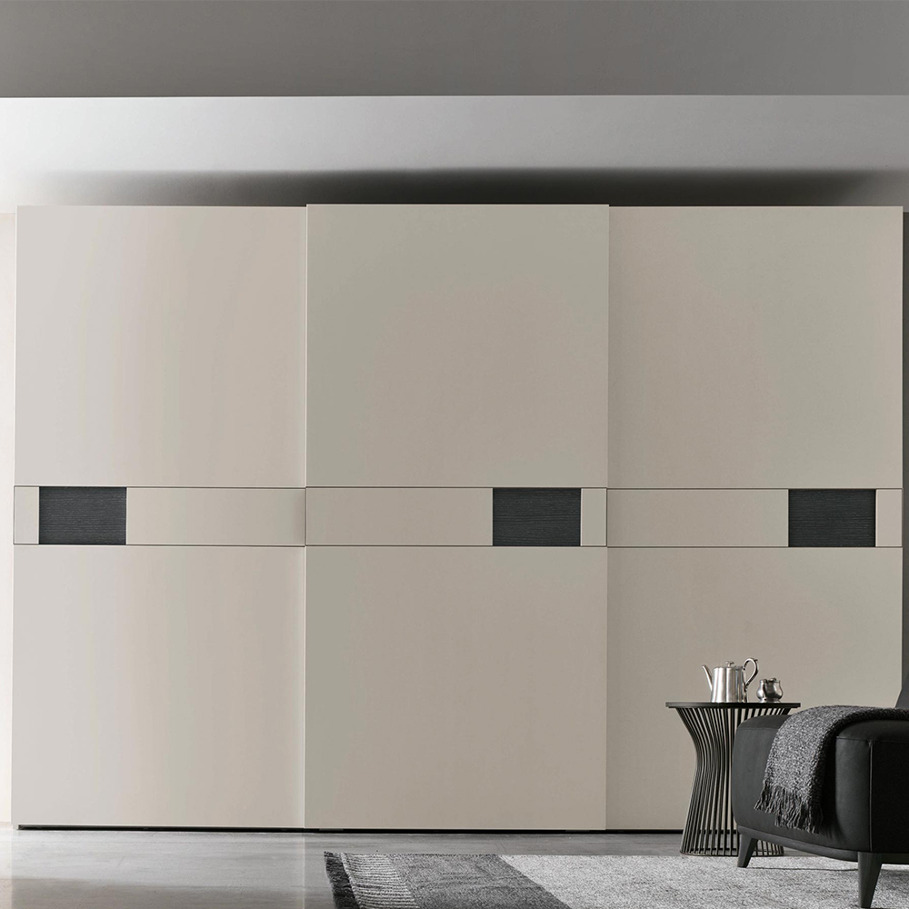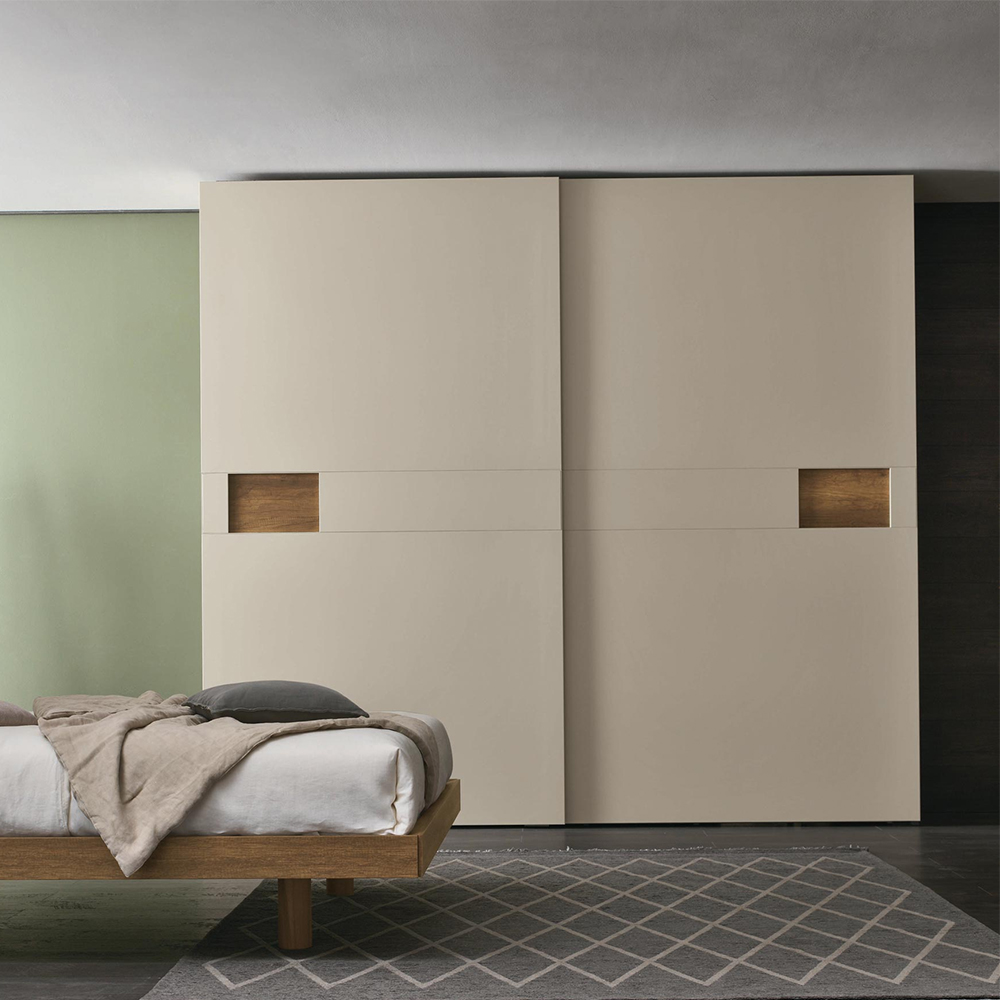 Шкаф с простыми геометрическими очертаниями украшают фактурные вставки, которые не только служат для декоративных целей, но и становятся захватом для удобного открытия раздвижной створки. Спальня становится просторной и стильной.