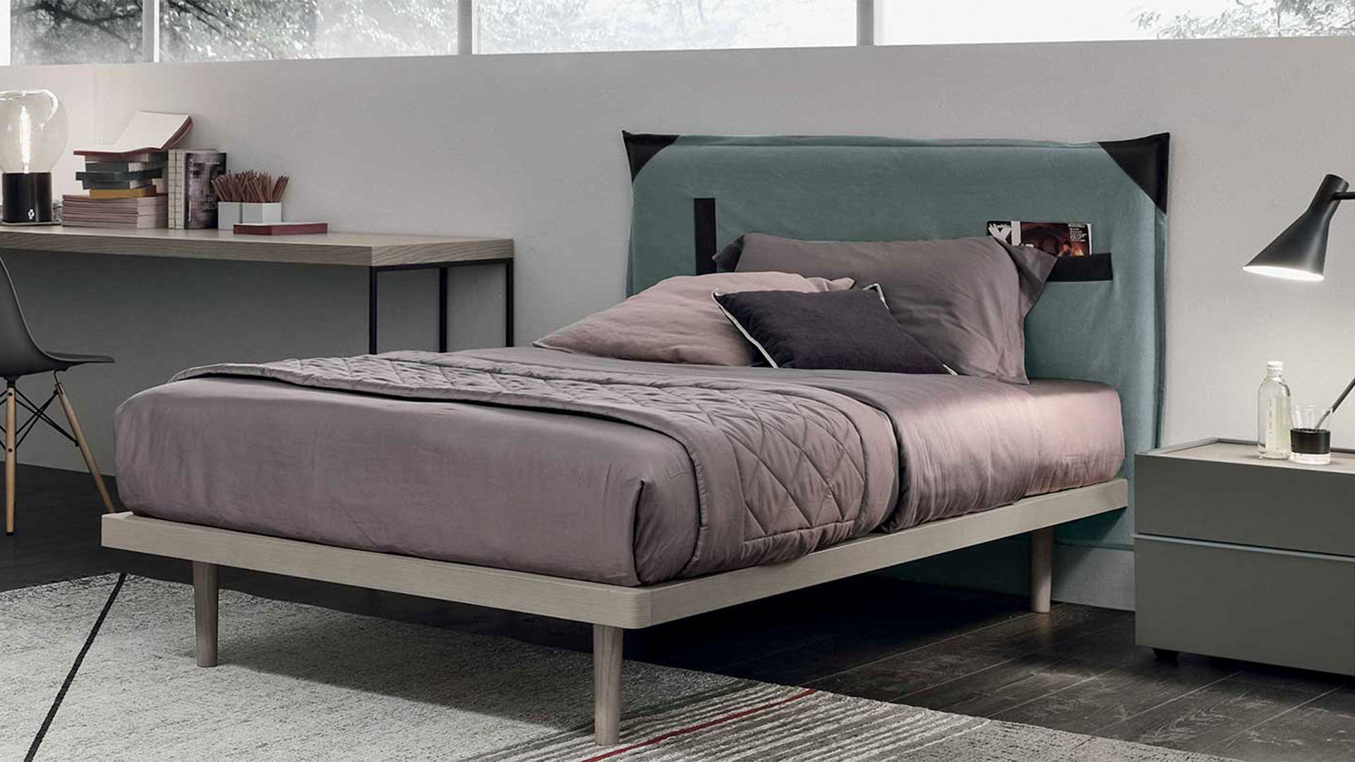 Как и в практичной одежде, в изголовье есть два кармана для журналов или других предметов, что придает кровати современный и многофункциональный вид. Вставки из экокожи, эконубука или кожи подчеркивают практичность этих деталей.