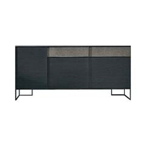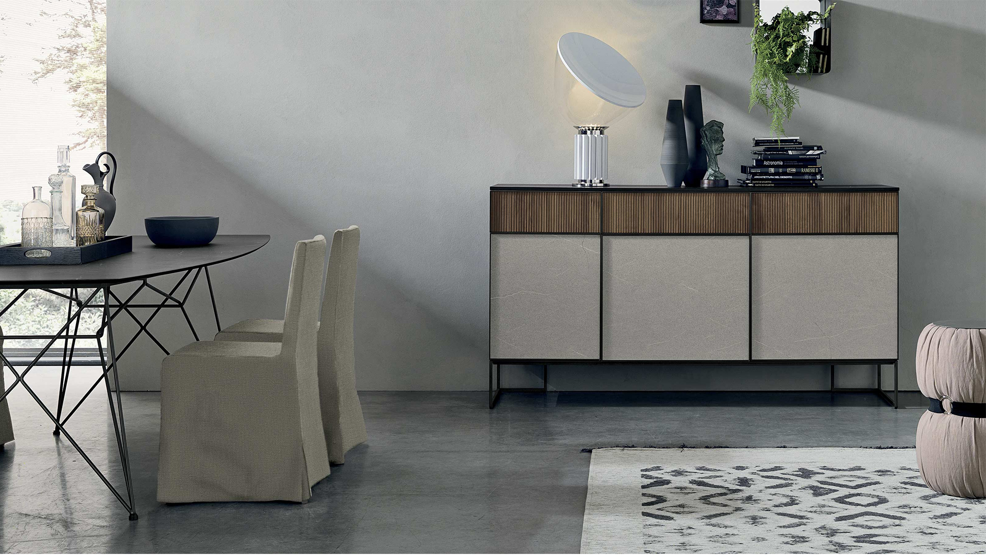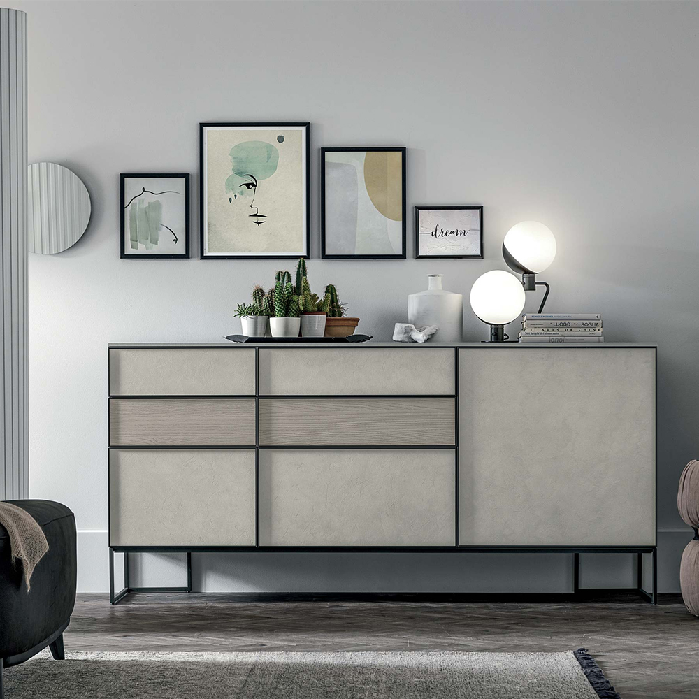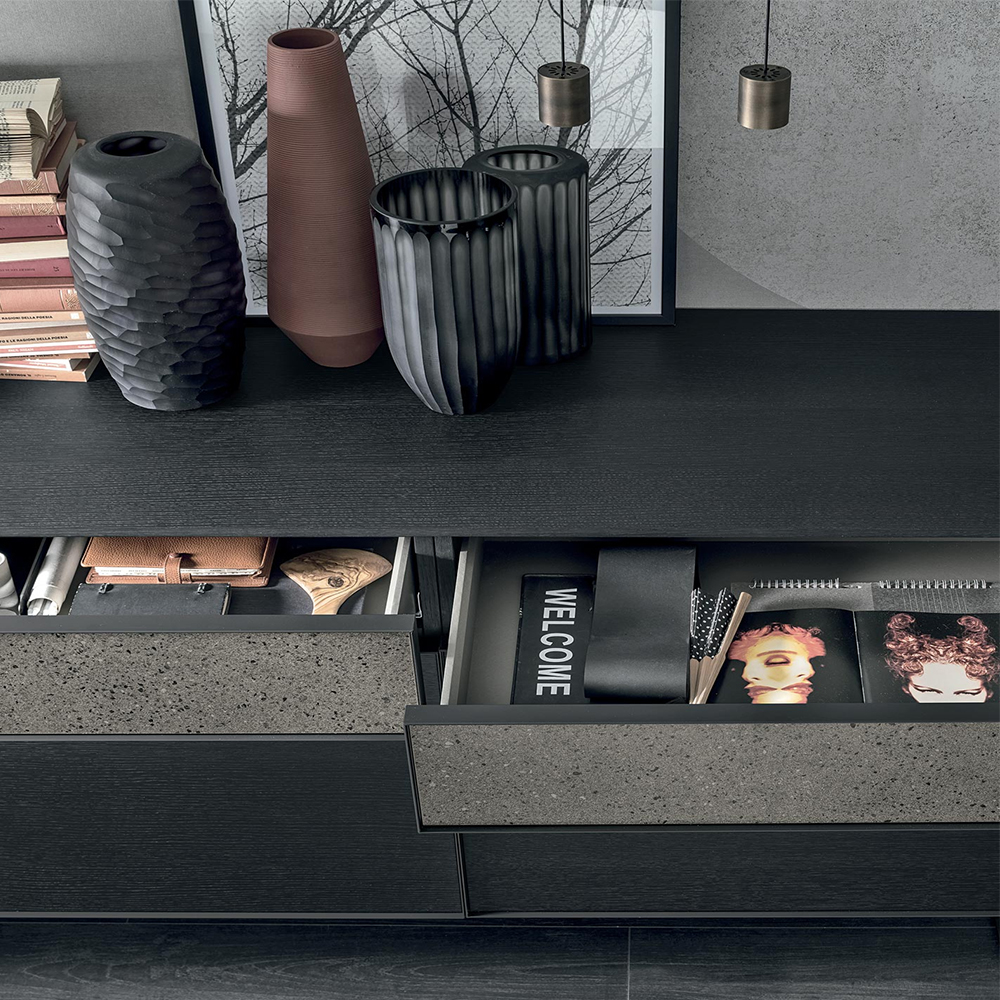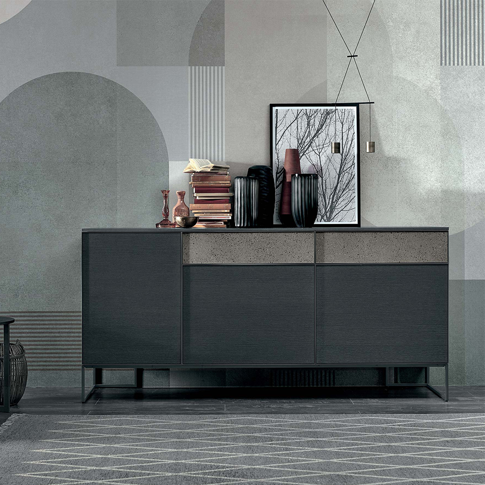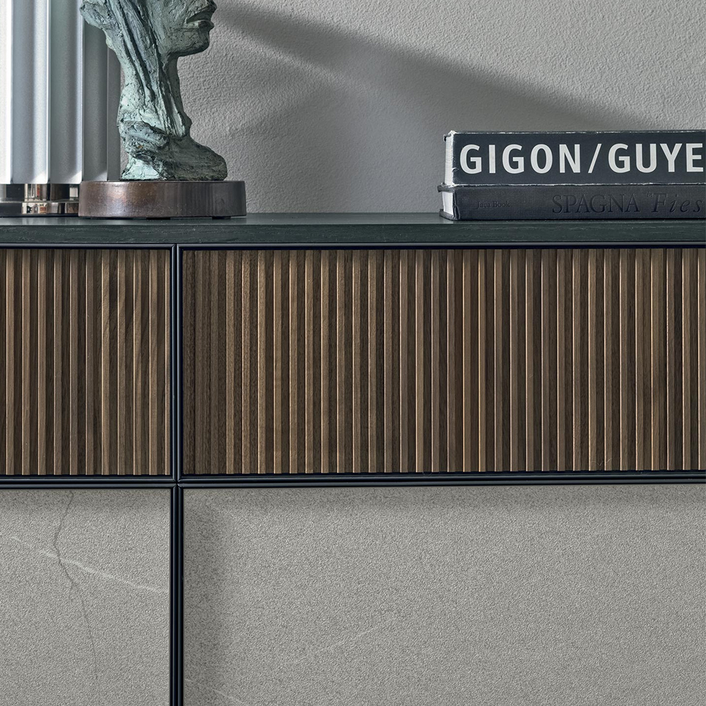 Фронтальные поверхности с ореховой отделкой «canetté» и эффектом камня обрамлены металлическим профилем, комбинированное оформление придает интерьеру графическую самобытность и фактурность. Сервант может представать в различных конфигурациях, адаптируясь ко всем современным стилистическим направлениям.