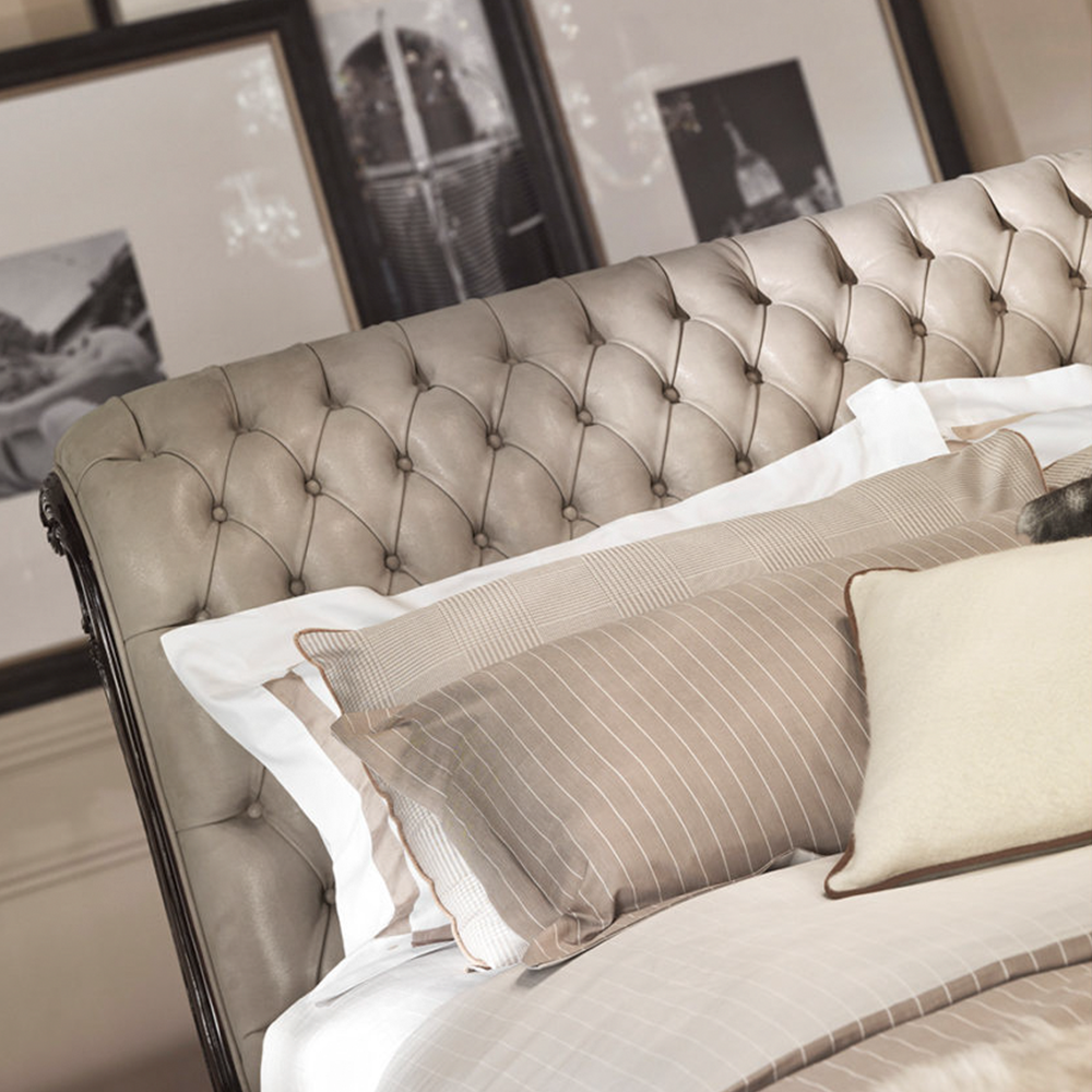 Изысканная кровать с оригинальным изголовьем, украшенным очаровательной отделкой капитоне в стиле королевы Анны и кожаной обивкой. Извилистые и элегантные линии подчеркнуты вращающимися передними ножками.