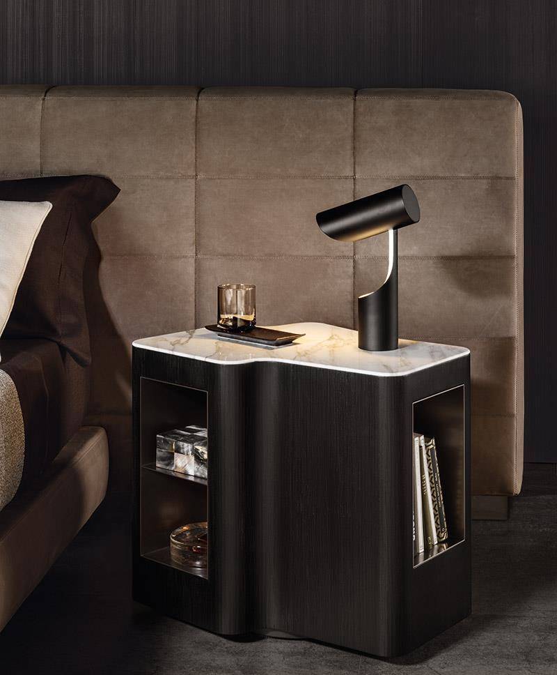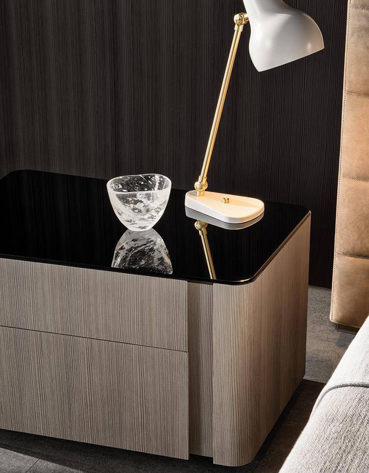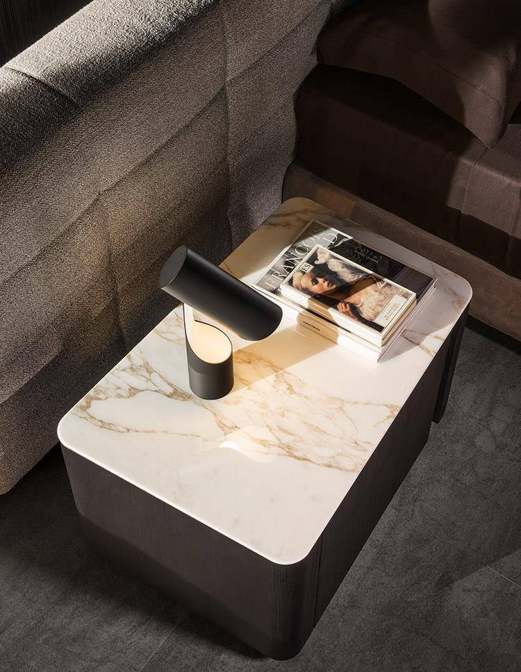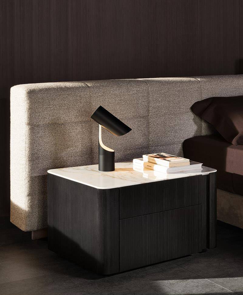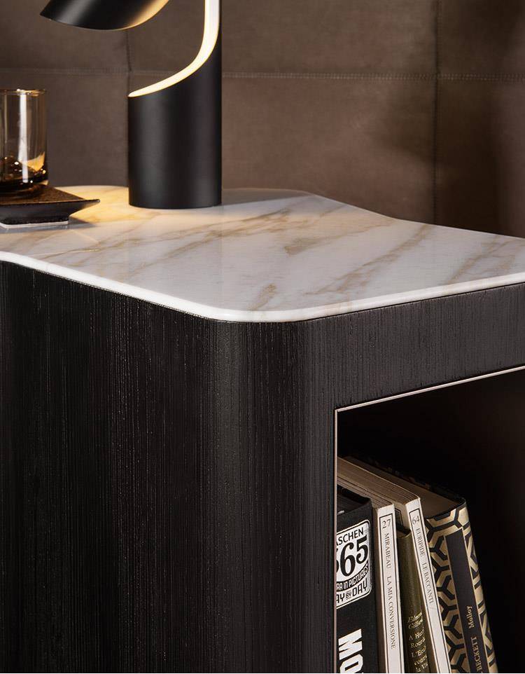 Прикроватная тумбочка Lou имеет структуру шпона лиственницы и поставляется в предварительно обработанном цвете Dove Grey или с лаковым покрытием с открытыми порами в цвете Licorice. Столешница, изготовлена из мрамора Calacatta и черного pate de verre. Тумбочка Lou имеет два удобных выдвижных ящика, которые открываются сбоку.