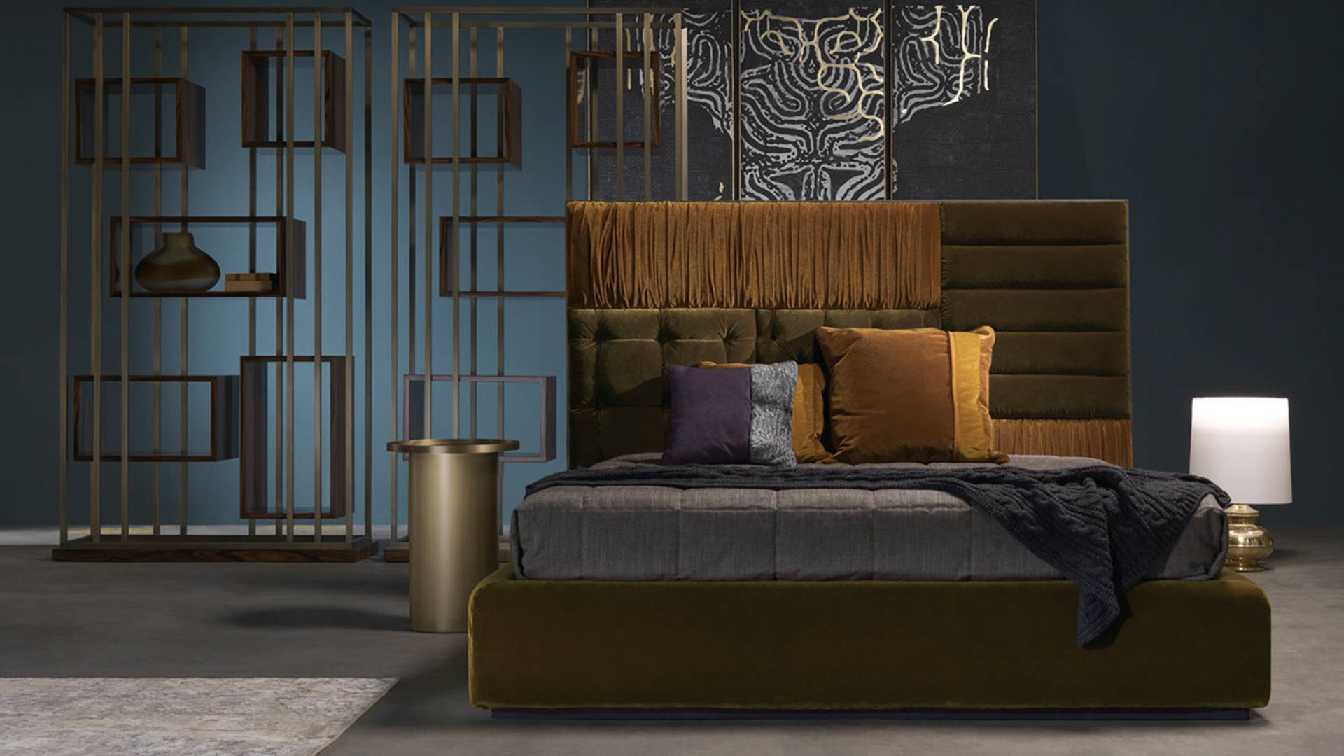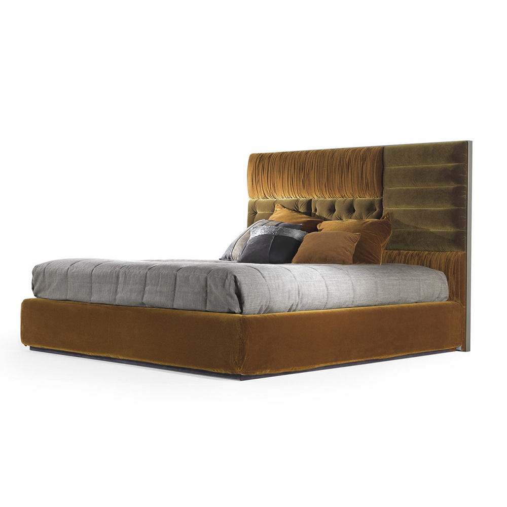 Элегантная кровать с высоким изголовьем, обитым стеганым и плиссированным бархатом. Структура из бука и пены с рамой в отделке из бронзированного металла. Тканевую обивку можно выбрать из каталога GF Home.