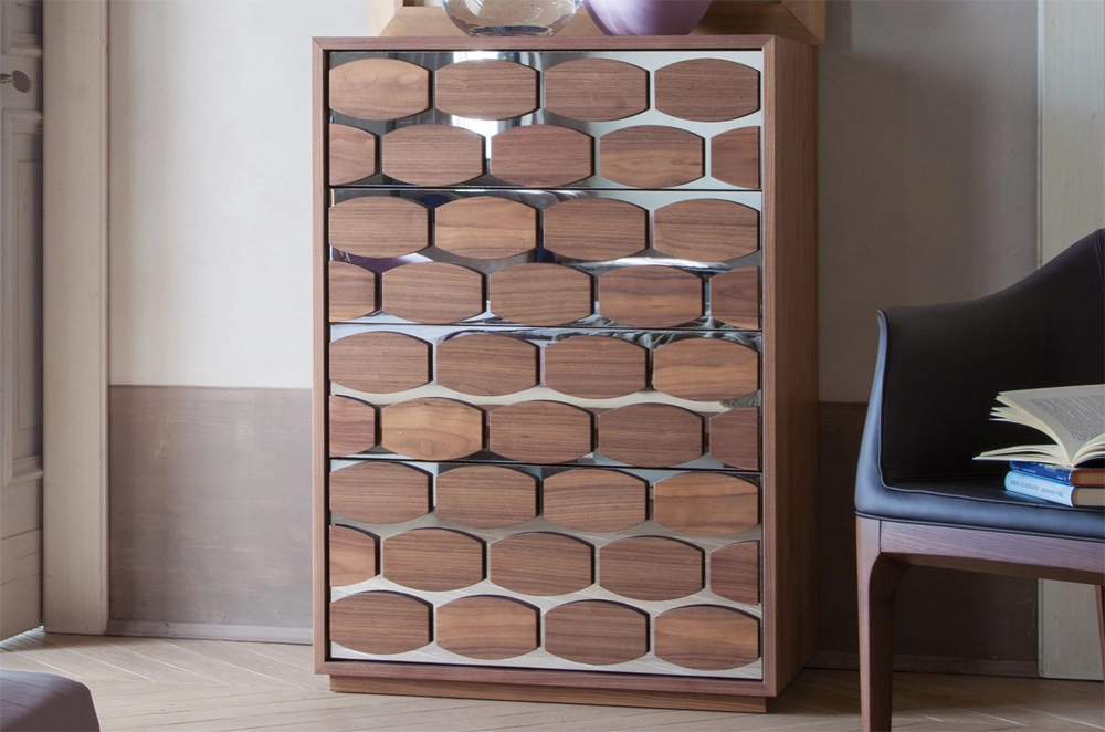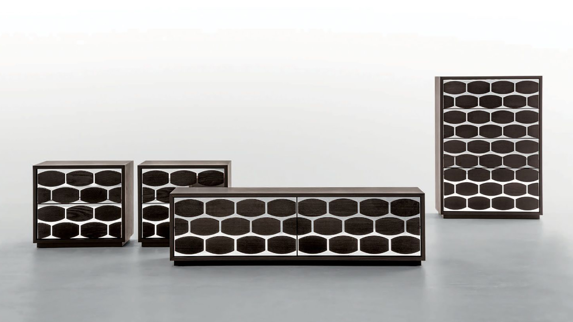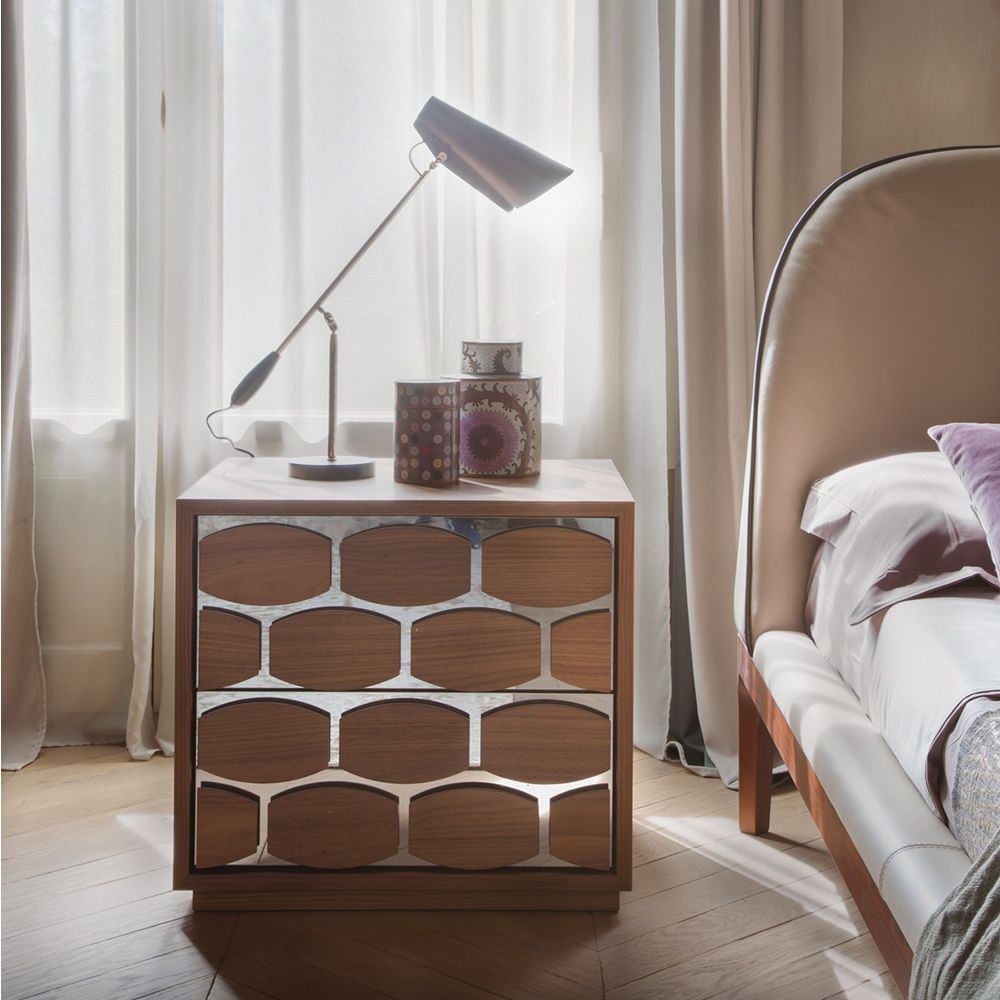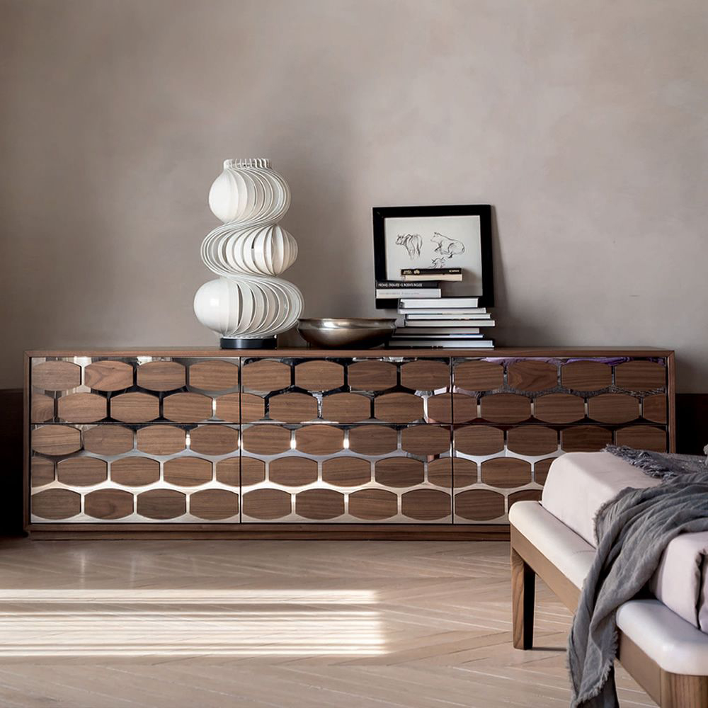 Набор мебели для спальни, где фундаментальную роль играют пространства и линии. Комод, тумбочка и ящик: характерный стиль Honey Night, который мы производим из дерева. Черный и темный орех, термообработанный дуб сочетаются с зеркалами, расширяя всю комнату.