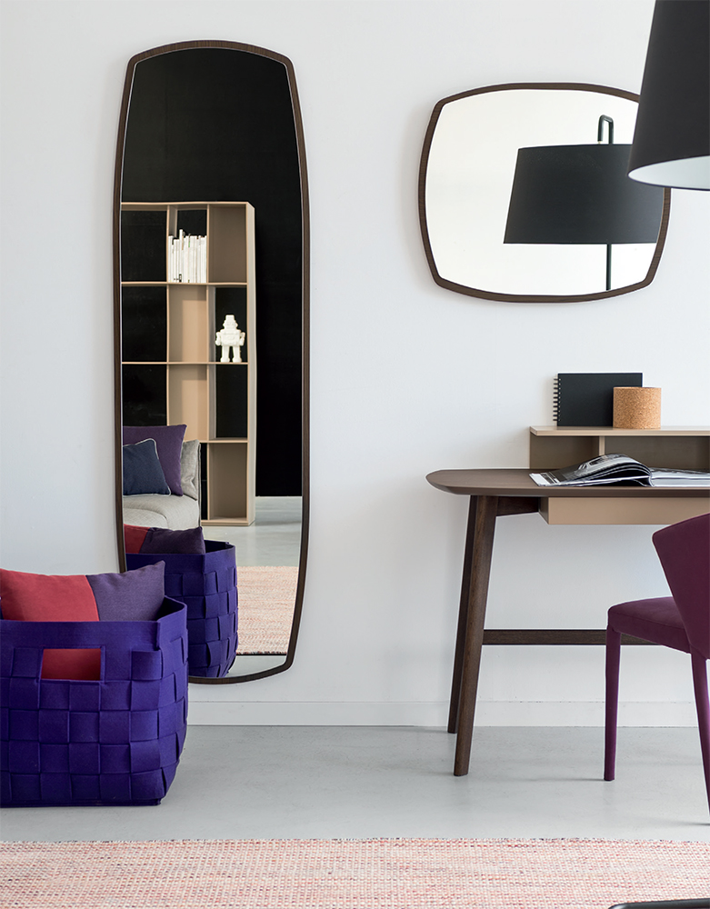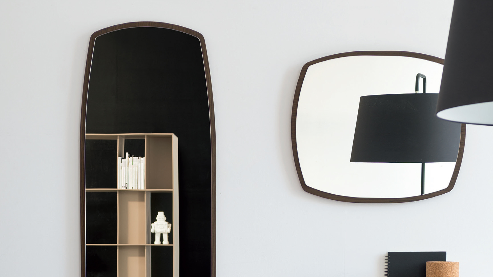 Match — это настенное зеркало с извилистыми линиями, слегка изогнутыми сторонами и рамой с отделкой под дерево и скошенными краями.