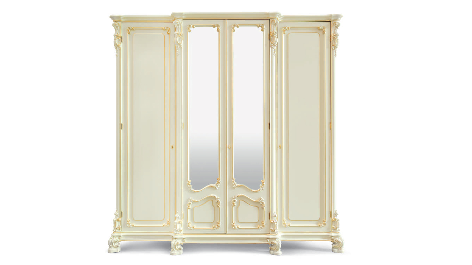 Платяной четырехдверный шкаф. Две центральные дверцы зеркальные. Внутреннее наполнение по желанию заказчика. Декор - пенополиуретан. Широкий выбор отделки.