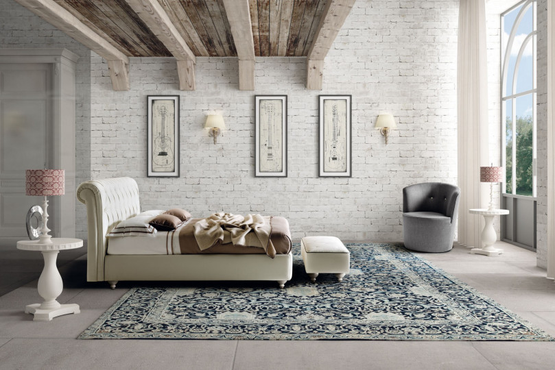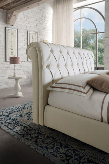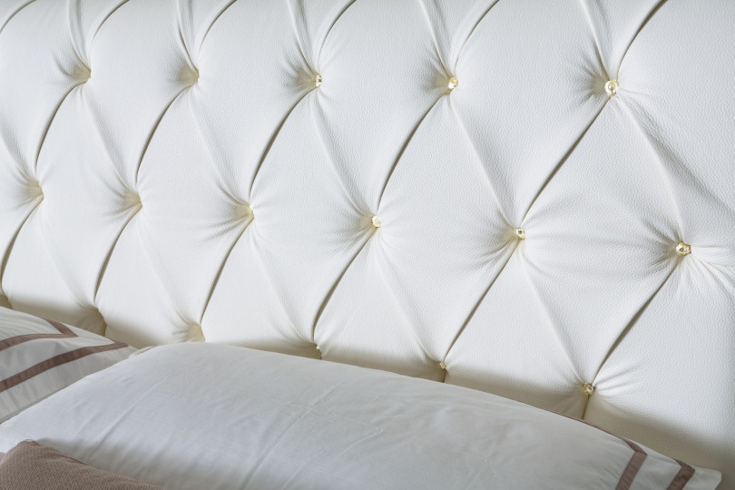 Изголовье, безусловно, оригинальное благодаря выступающему фигурному профилю, который проецирует гармоничную композицию Rafaello на заветную и пережиточную атмосферу классической эпохи. О последних также метко напоминает элегантный рисунок центральной обивки, пространство которой расставлено ровными тканевыми пуговицами или полированными орнаментальными кристаллами.