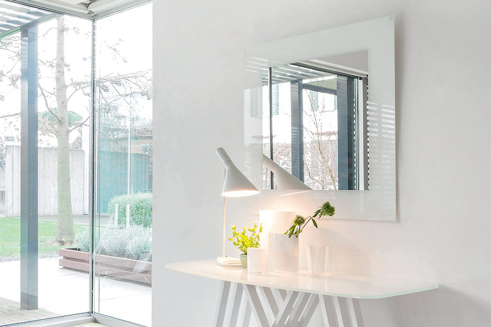 Шелкография на раме, геометрическая и точная, завершающая простую современность зеркала Toshima. Отделка зеркал в вариациях шелкографии позволяет создать абсолютный минимализм в каждой комнате.