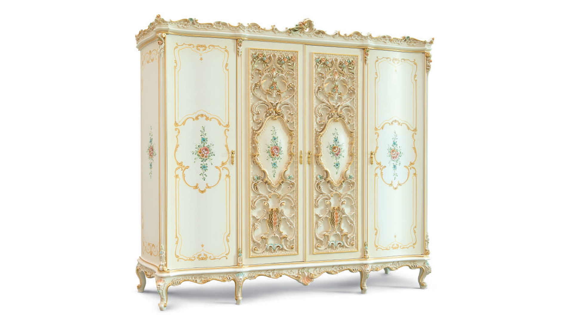 Четырехдверный шкаф. Внутри центральных дверц зеркала. Внутреннее наполнение по желанию заказчика. Декор - пенополиуретан. Возможны другие варианты отделки.