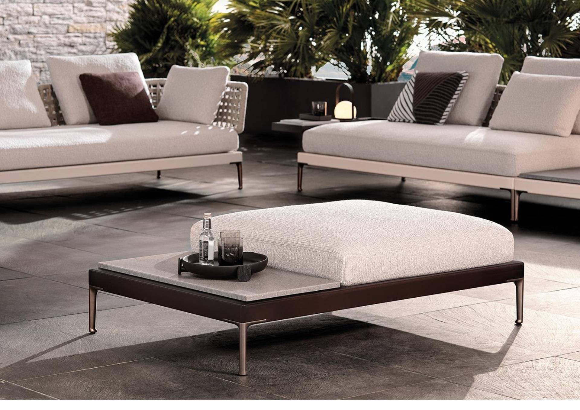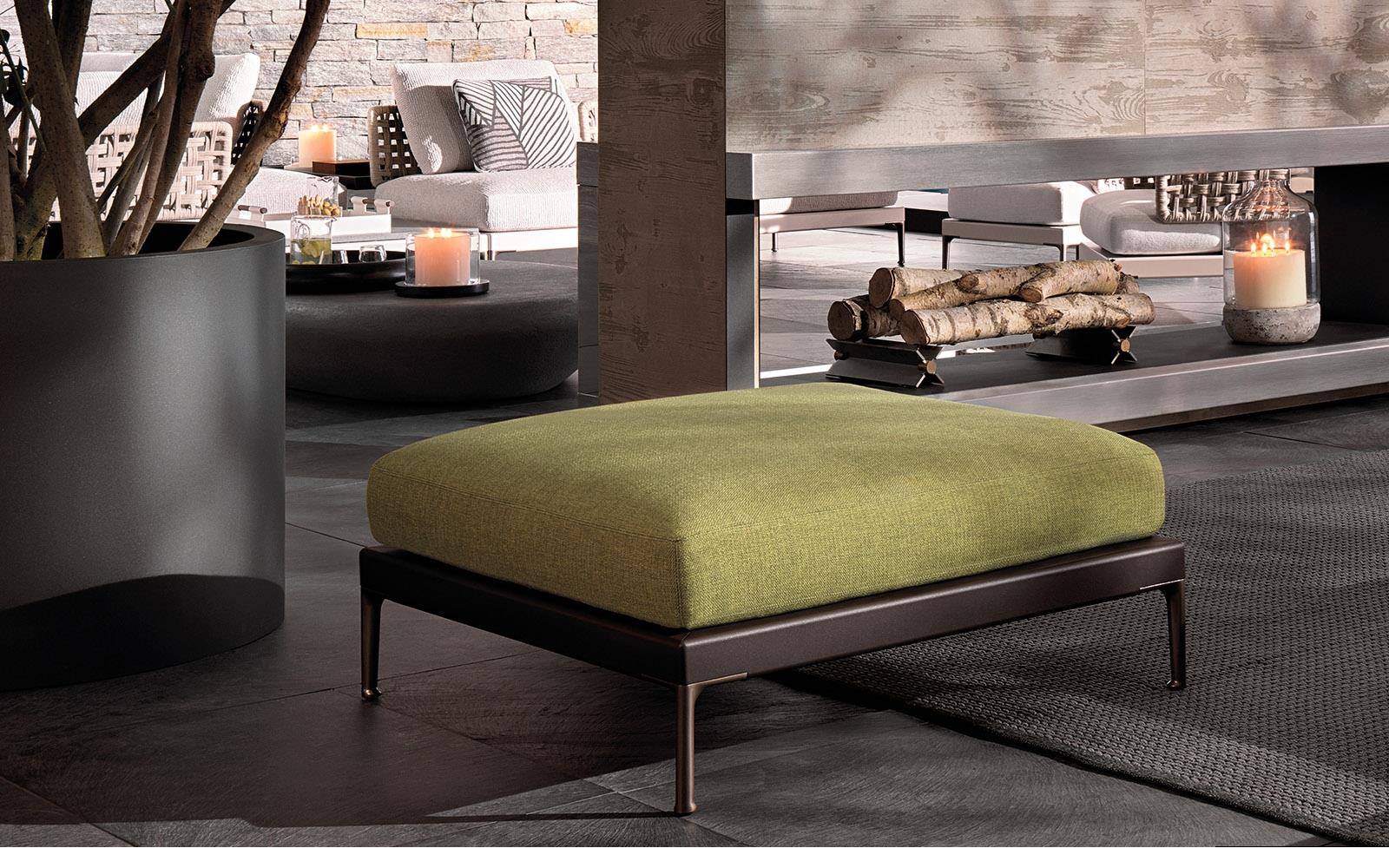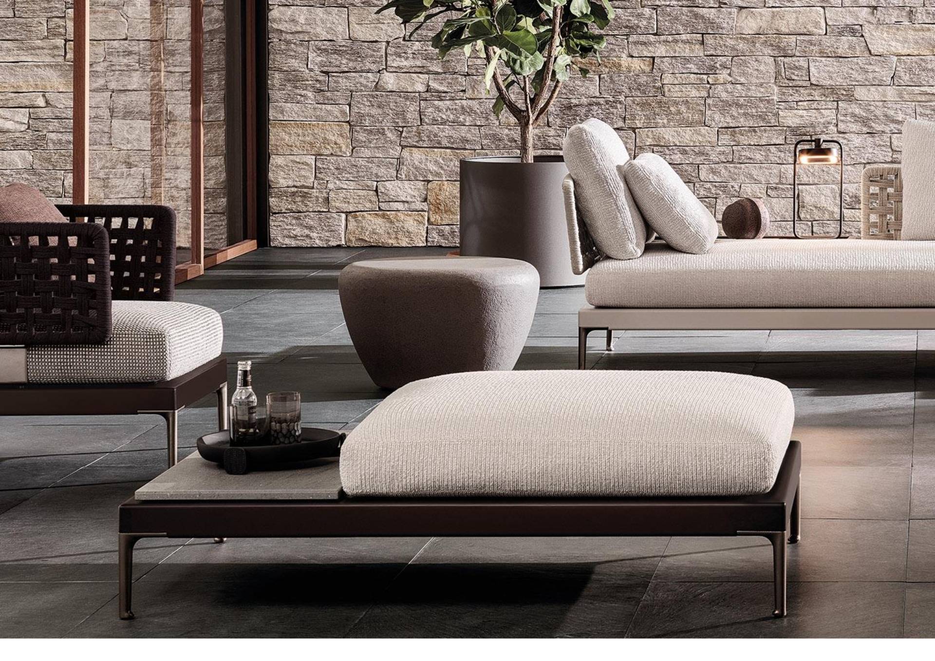 Изучив использование дерева, такого как ироко и тик, в Patio, разработанном итало-датской студией GamFratesi, Minotti предлагает неожиданное сочетание различных материалов: алюминия, дерева, камня, шнура.