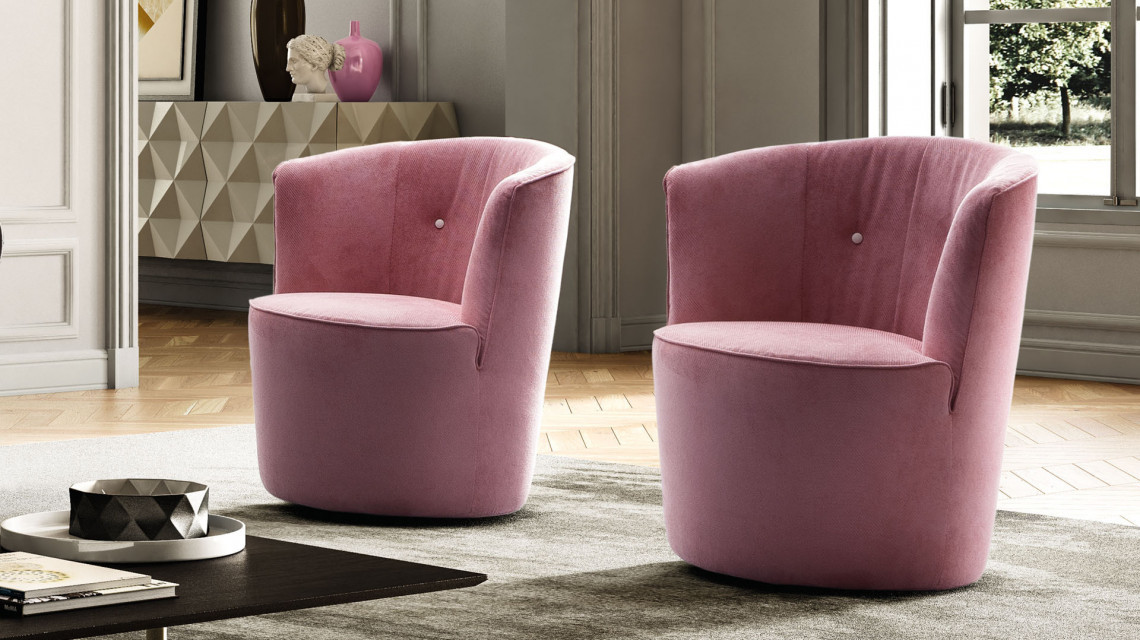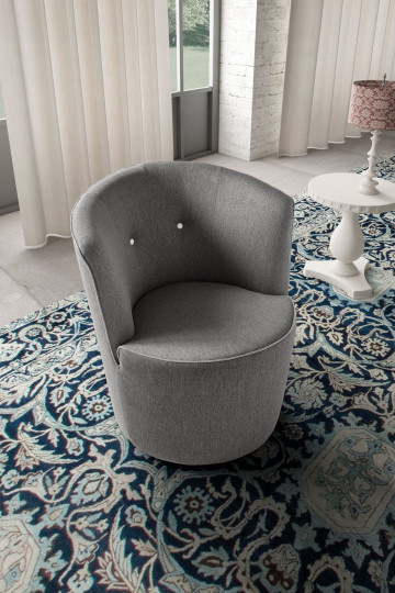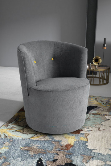 В этом кресле изысканного вкуса и привлекательности округлая выпуклая основа переходит в изысканную спинку, украшенную двумя элегантными центральными пуговицами, к тихому танцу, обрамляющему сиденье.