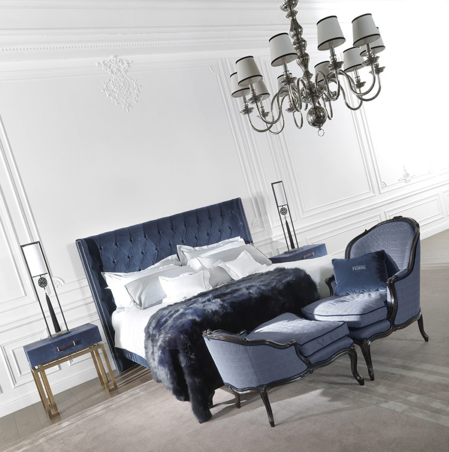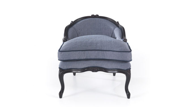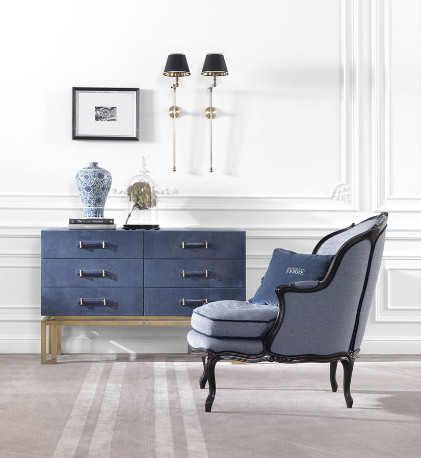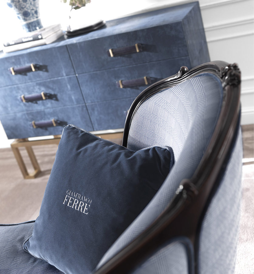 Отделка из ткани, цвет голубой. Основа из дерева, цвет темно-коричневый с патиной. Подушка сидения из натурального пуха, чехол съемный. Коллекция состоит из пуфа и кресла.