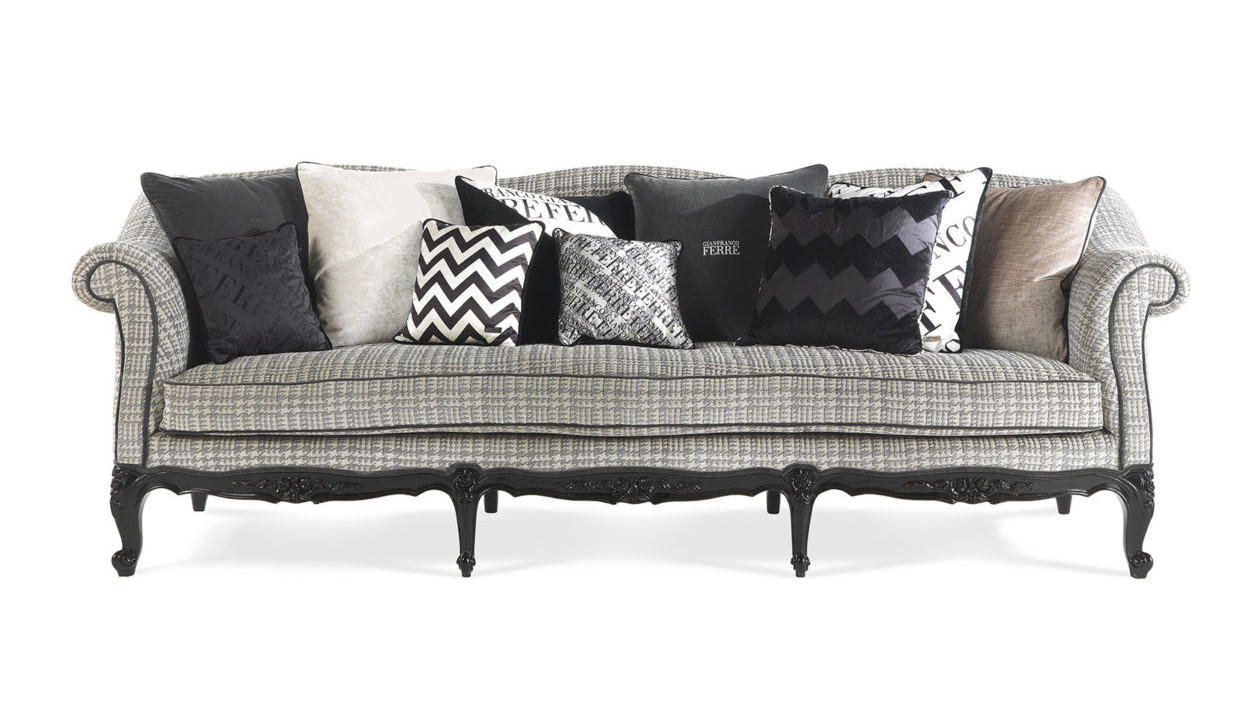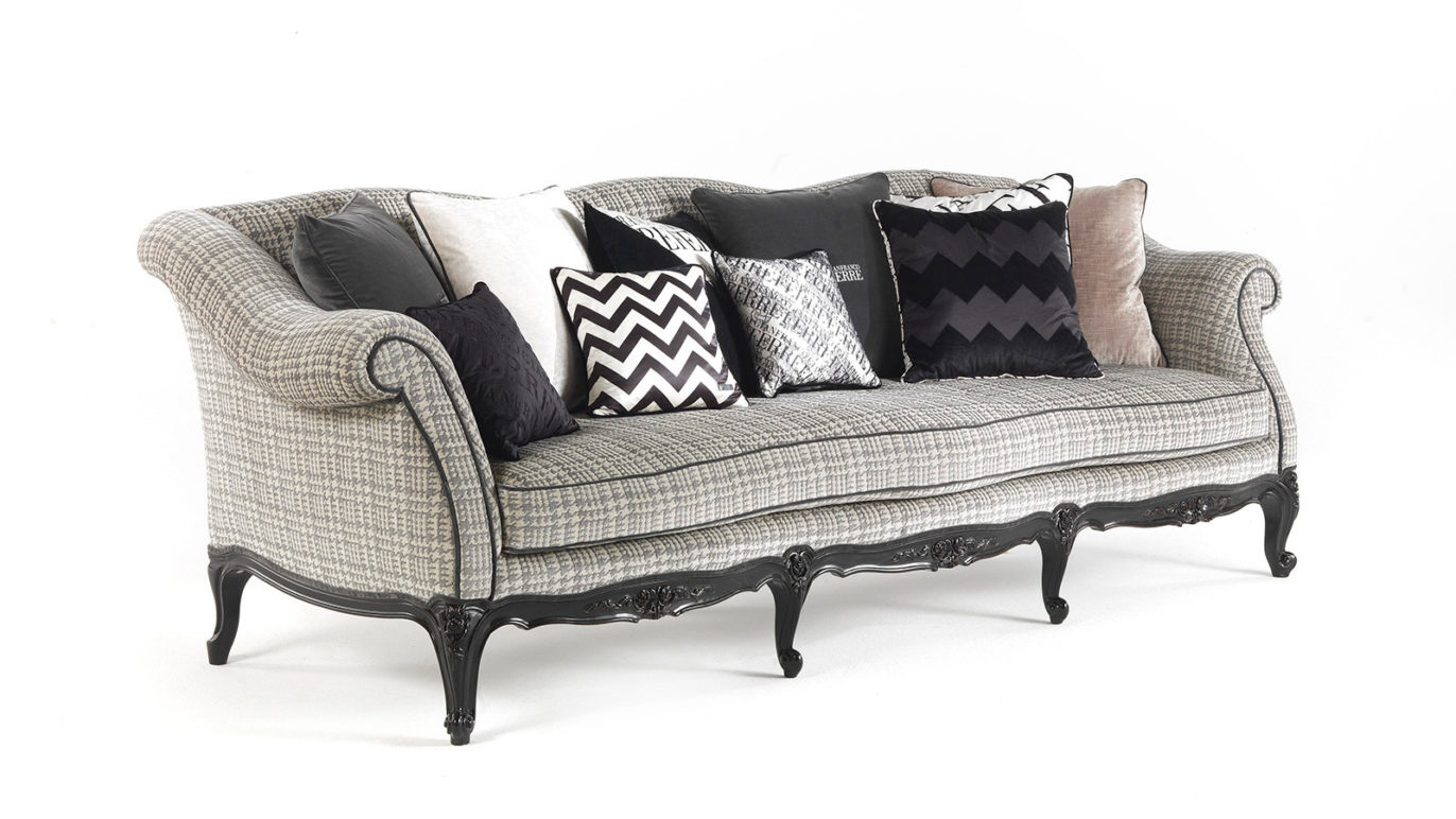 Эстетические образцы классического мира переосмыслены в современном ключе. Изысканность портняжных деталей, выраженная в обивке pied de poul, подчеркивается контрастной окантовкой, а резьба на ножках в стиле Людовика XV создает гармоничную смесь языков.