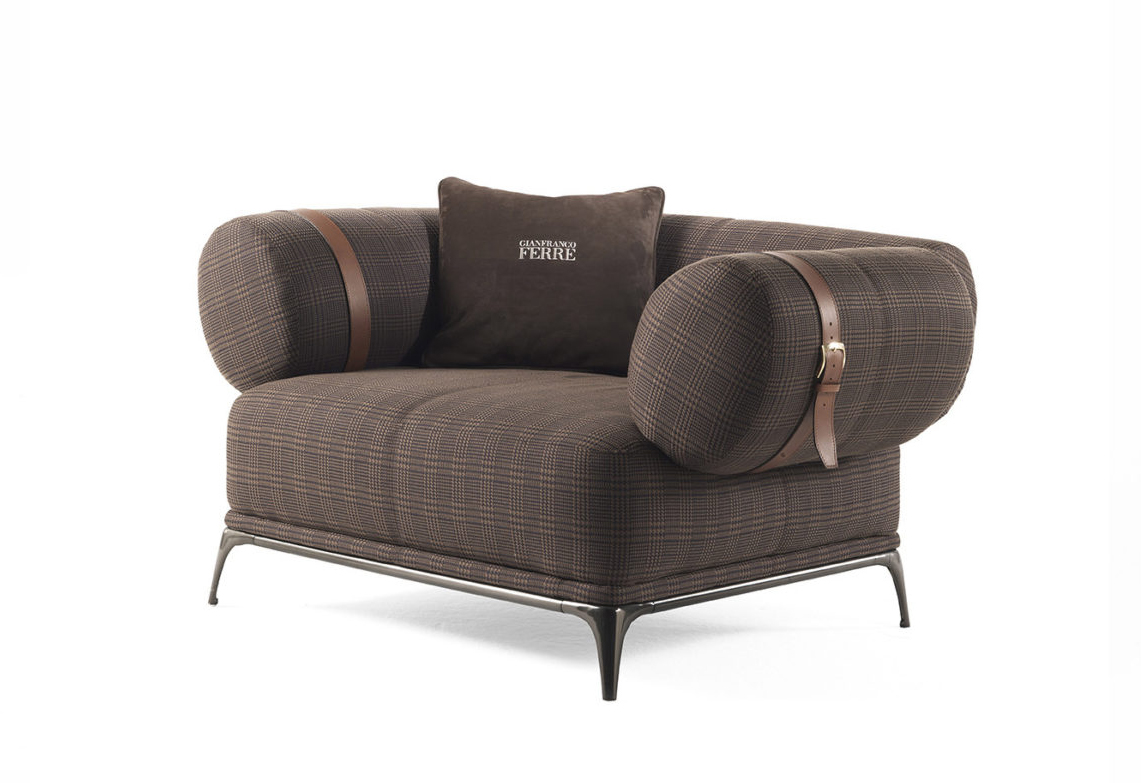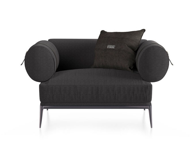 Кресло Phoenix в обновленном винтажном стиле с подлокотниками и спинкой овальной формы, слегка наклоненной наружу и обитой черной тканью с узлами. Отсылка к наследию Джанфранко Ферре, присутствующая в использовании ткани для мужской одежды, обогащена более теплым и гостеприимным шармом, а металлическая основа с отделкой из черного хрома выражает типичную для бренда солидность.